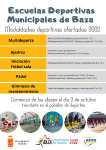 Abiertas las inscripciones para las escuelas deportivas municipales para el curso que  comenzará el próximo 3 de octubre. Ya están abiertas las inscripciones para las Escuelas Deportivas Municipales, con fecha límite del día 10 de octubre, las cuales han de ser formalizadas en el Pabellón Municipal de Deportes, en horario de mañana de 10h a 13h y, de tarde, desde las 16 a las 21horas, mientras que las clases darán comienzo el próximo lunes 3 de octubre.