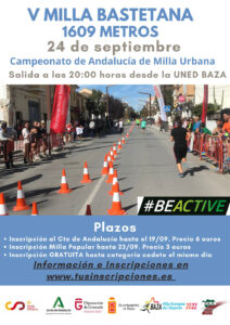 Por primera vez en la historia deportiva de Baza, la ciudad acoge el Campeonato de Andalucía de Milla Urbana. Una Milla Urbana que se disputará el próximo sábado 24 de septiembre, en la Avenida José de Mora, y para la que se  han de formalizar las correspondientes inscripciones, en la categoría de Milla popular, hasta el día 23 de septiembre, en el anterior enlace y al precio de tres euros, mientras que las inscripciones para participar en el Campeonato de Andalucía se cerraban el pasado 19 de este mismo mes, con un precio de 6 euros por atleta.