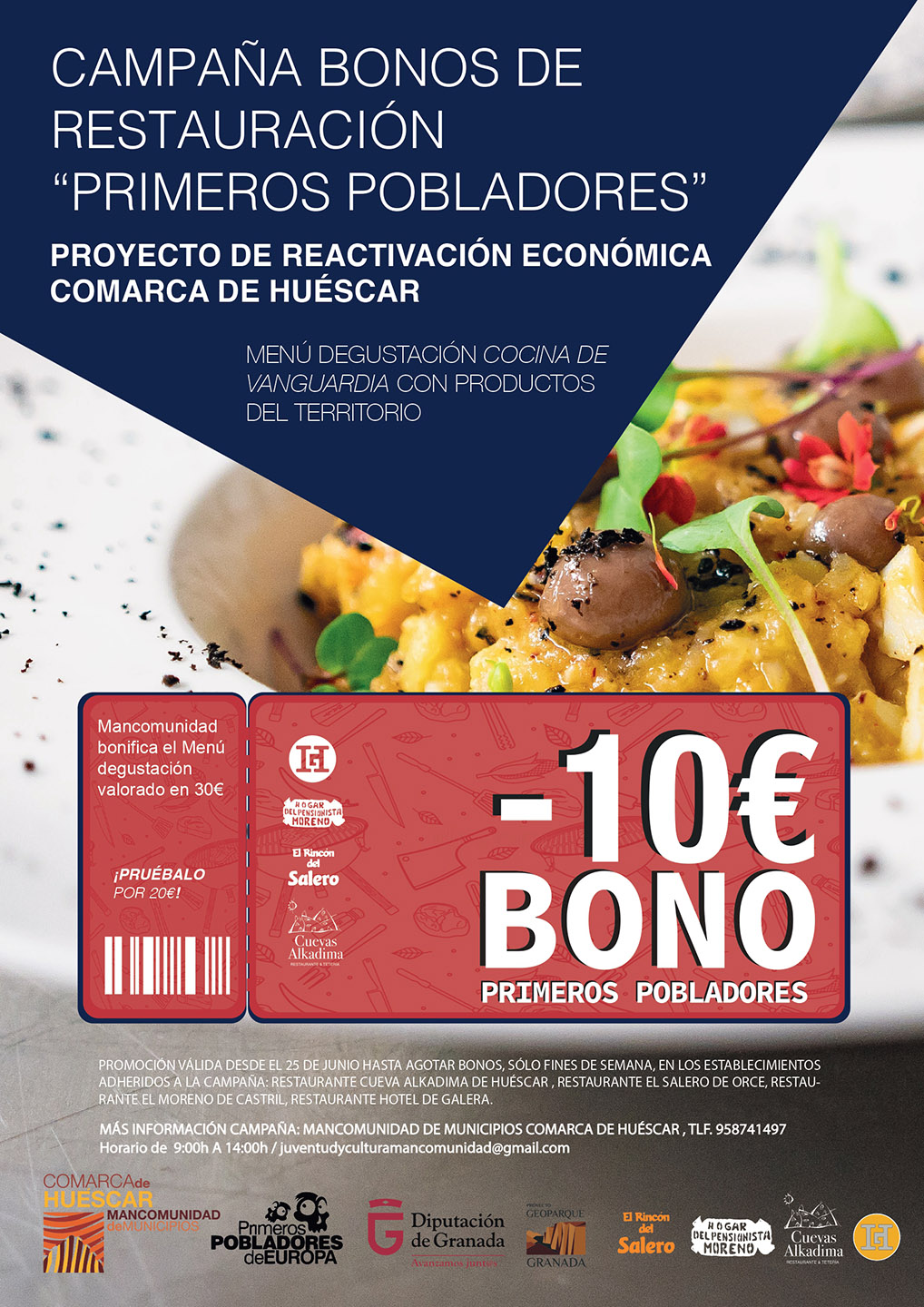 La Mancomunidad Comarca de Huéscar pone en marcha la Campaña de Bonos de restauración «Primeros Pobladores». La Mancomunidad de Municipios de la Comarca de Huéscar pone en marcha, a partir del 25 de junio, su Campaña de Bonos para la Restauración «Primeros Pobladores», que se mantendrá activa hasta que se agoten dichos bonos.