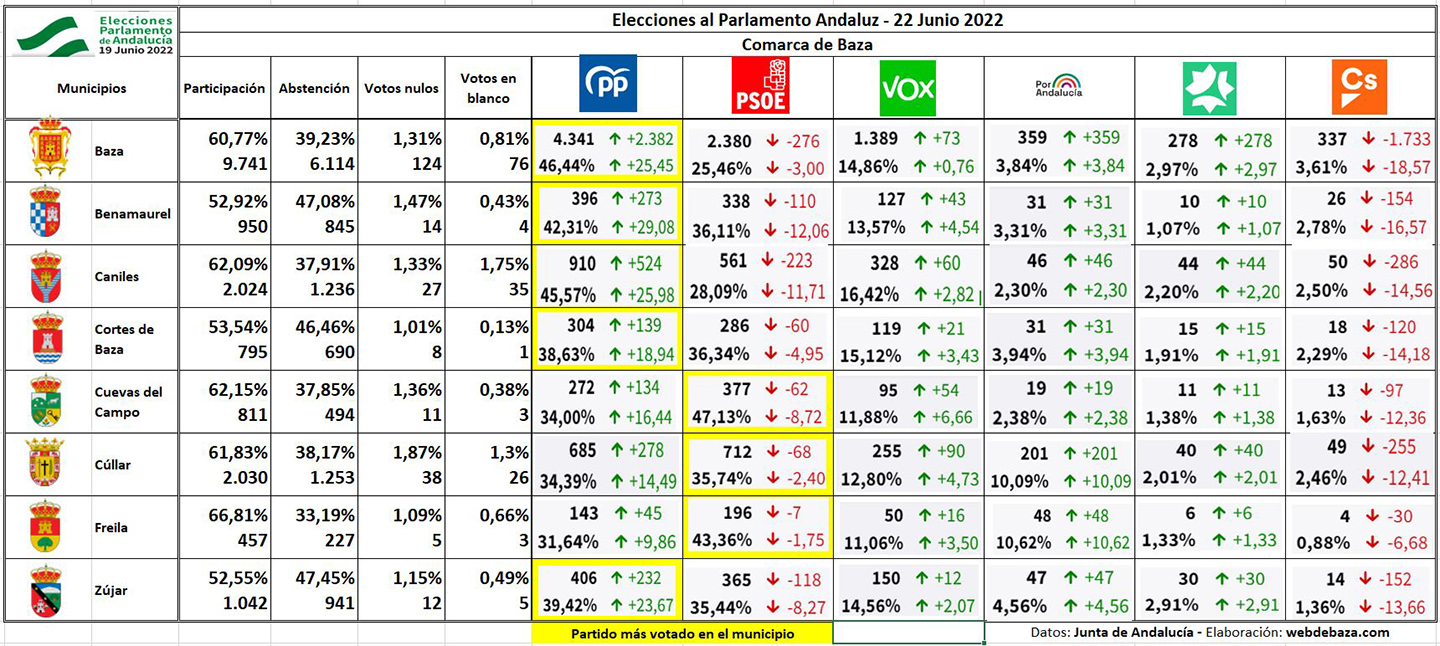Así fueron los resultados electorales en los 14 municipio de las comarcas de Baza y Huéscar. Ofrecidos a nuestros lectores los resultados de las elecciones al Parlamento andaluz de Baza y Andalucía, llega el momento de dar un repaso a lo acontecido en los diferentes municipios de las comarcas de Baza y Huéscar, para lo que hemos elaborado las tablas que ofrecemos a continuación y en las que se recogen los datos más destacados de estas agrupaciones territoriales.