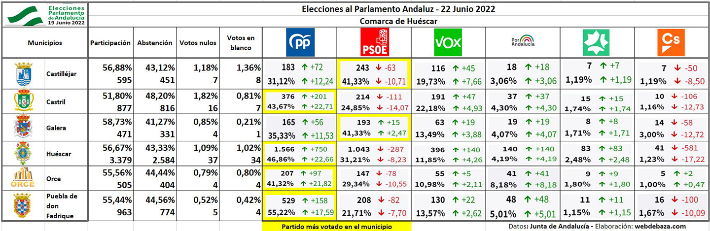 En el caso de la comarca oscense, el PP se alzaba vencedor con triunfos parciales en cuatro de los seis municipios, mientras que Castilléjar y Galera daban el triunfo parcial al PSOE, aunque repitiendo la circunstancia de pérdida de votantes en todos los municipios de la comarca, algo que volvía a repetirse de manera mucho más notable en el caso de Ciudadanos.