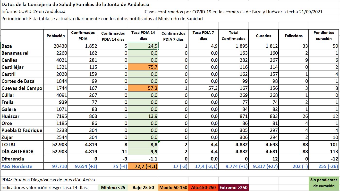 Tranquilidad casi absoluta en la última jornada con una nueva bajada de la tasa de incidencia en Baza y otros 12 curados en las comarcas de Baza y Huéscar. De no haber sido porque la ciudad de Baza rebajaba en tres enfermos los confirmados en los últimos 14 días, lo cual ha supuesto que esa tasa pase a ser de 24,5, solo habría que hablar de las personas que se han curado, según los últimos datos de la Consejería de Salud de la Junta de Andalucía, y que han sumado un total de 12, repartidas con 5 personas en Baza, 4 en Zújar, 2 en Huéscar y 1 en Castril.