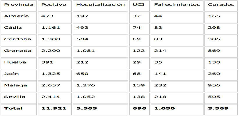 La Consejería Salud y Familias informa que se han confirmado en Andalucía 232 nuevos casos de Coronavirus en las últimas horas. El número total de afectados por coronavirus en Andalucía asciende a 11.921, después de que el último informe de la Consejería Salud y Familias de la Junta de Andalucía confirmara que han sido 232 los nuevos casos de Coronavirus en las últimas horas.