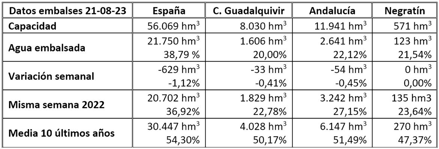 Siguen bajando las reservas hídricas con la española al 38,79% de su capacidad, un 20% en la Cuenca del Guadalquivir y el Negratín al 21,54%. La reserva hídrica española está al 38,8 por ciento de su capacidad total. Los embalses almacenan actualmente 21.750 hectómetros cúbicos (hm³) de agua, disminuye en la última semana en 629 hectómetros cúbicos, equivalentes al 1,1 por ciento de la capacidad total actual de los embalses.