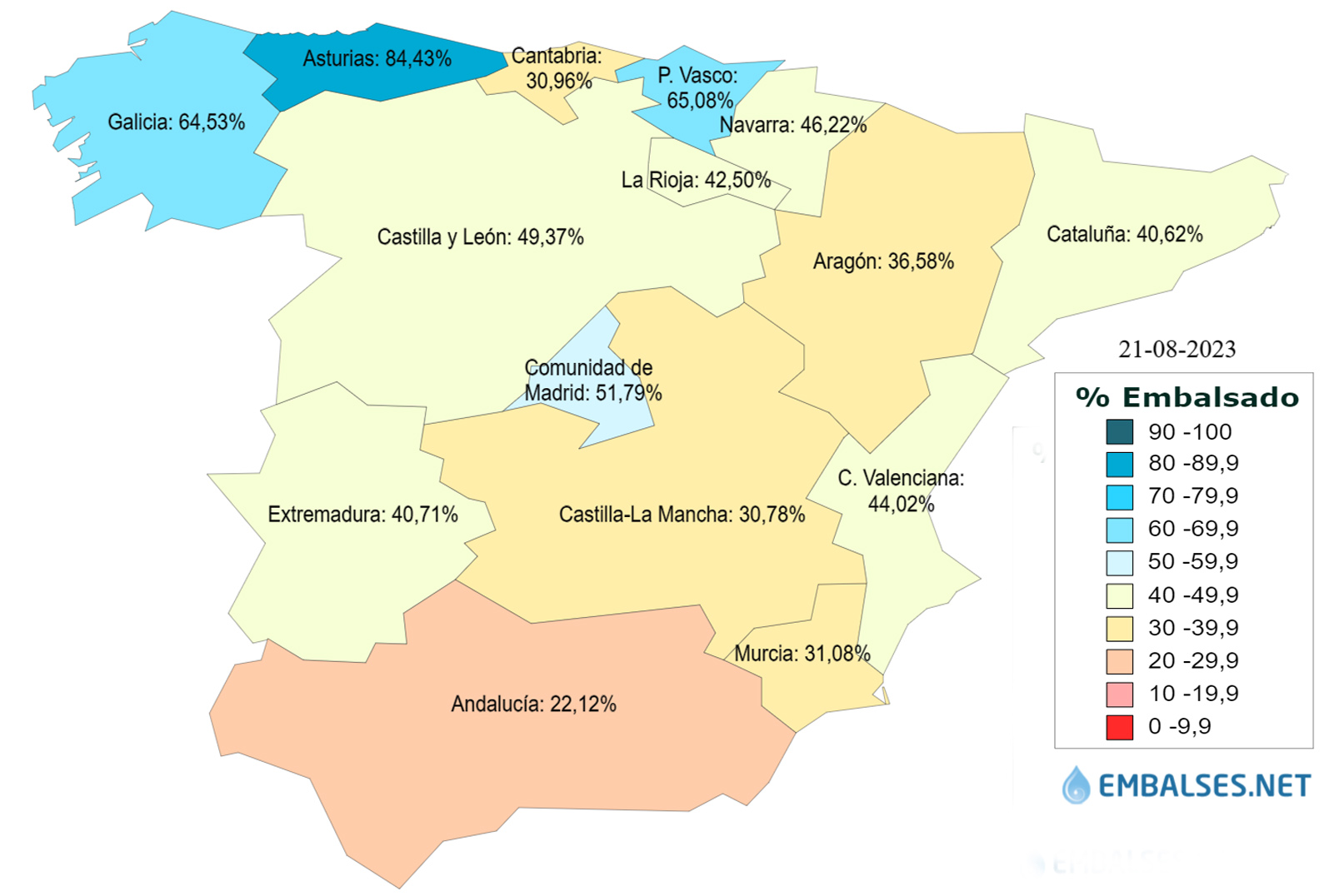 Entre el 60% y el 30%, las cuencas del Júcar al 49,3%, Tajo al 49,0%, Duero al 48,4% y Ebro al 39,9%.