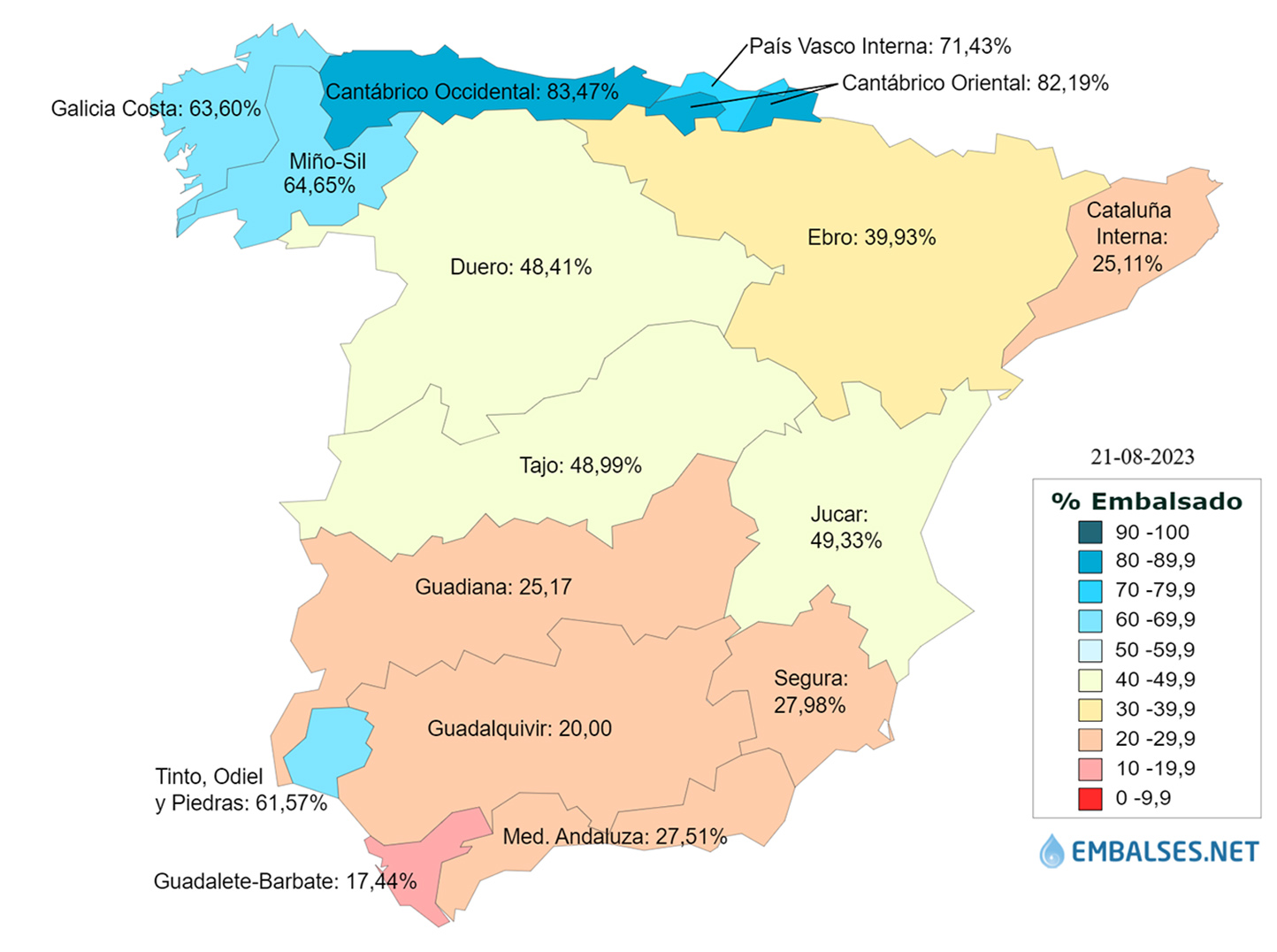 Las cuencas que se encuentran con un almacenamiento superior al 60% son: Cantábrico Occidental al 83,5%, Cantábrico Oriental se encuentra al 82,2%, Cuencas internas del País Vasco al 71,4%, Miño-Sil al 64,7%, Galicia Costa al 63,6% y Tinto, Odiel y Piedras al 61,6%