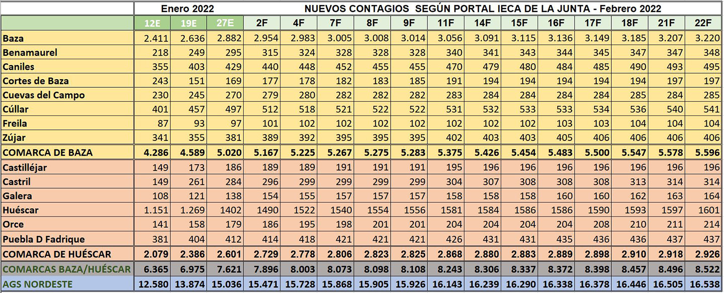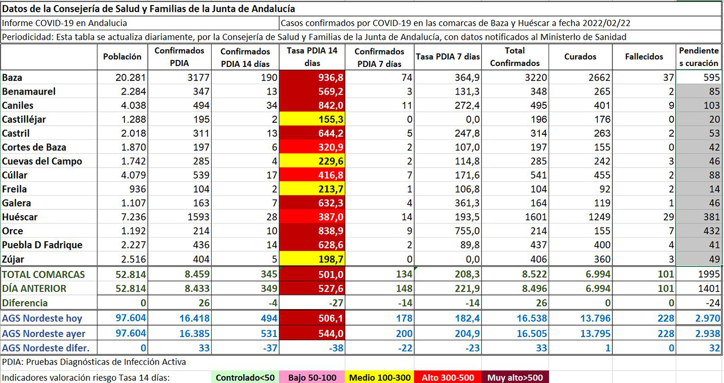 A nivel global, las comarcas de Baza y Huéscar añadían 26 casos más, pero rebajaban en 4 sus casos de confirmados PDIA a 14 días y en 14 los casos a una semana, rebajando ambas tasas hasta los 501,0 y los 208,3 casos por 100.000 habitantes, aunque no se notificaron nuevos curados, por lo que esta cifra subía hasta los 1.446.