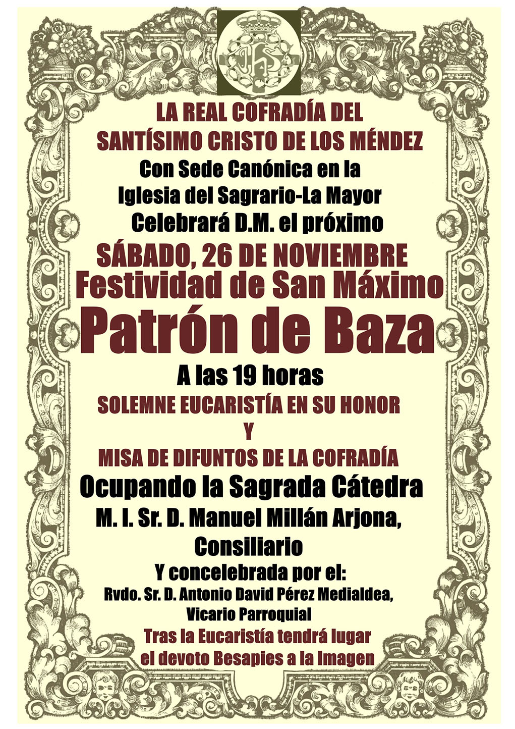 La Cofradía del Cristo de los Méndez volverá a celebrar la festividad del Patrón de Baza, san Máximo 2022. Como ha venido ocurriendo en los últimos años, es de nuevo la Real Cofradía del Stmo. Cristo de los Méndez de Baza la que se encargará de celebrar la festividad del Patrón de Baza, san Máximo, patrón de la ciudad, desde el mismo año de la conquista de nuestra ciudad.