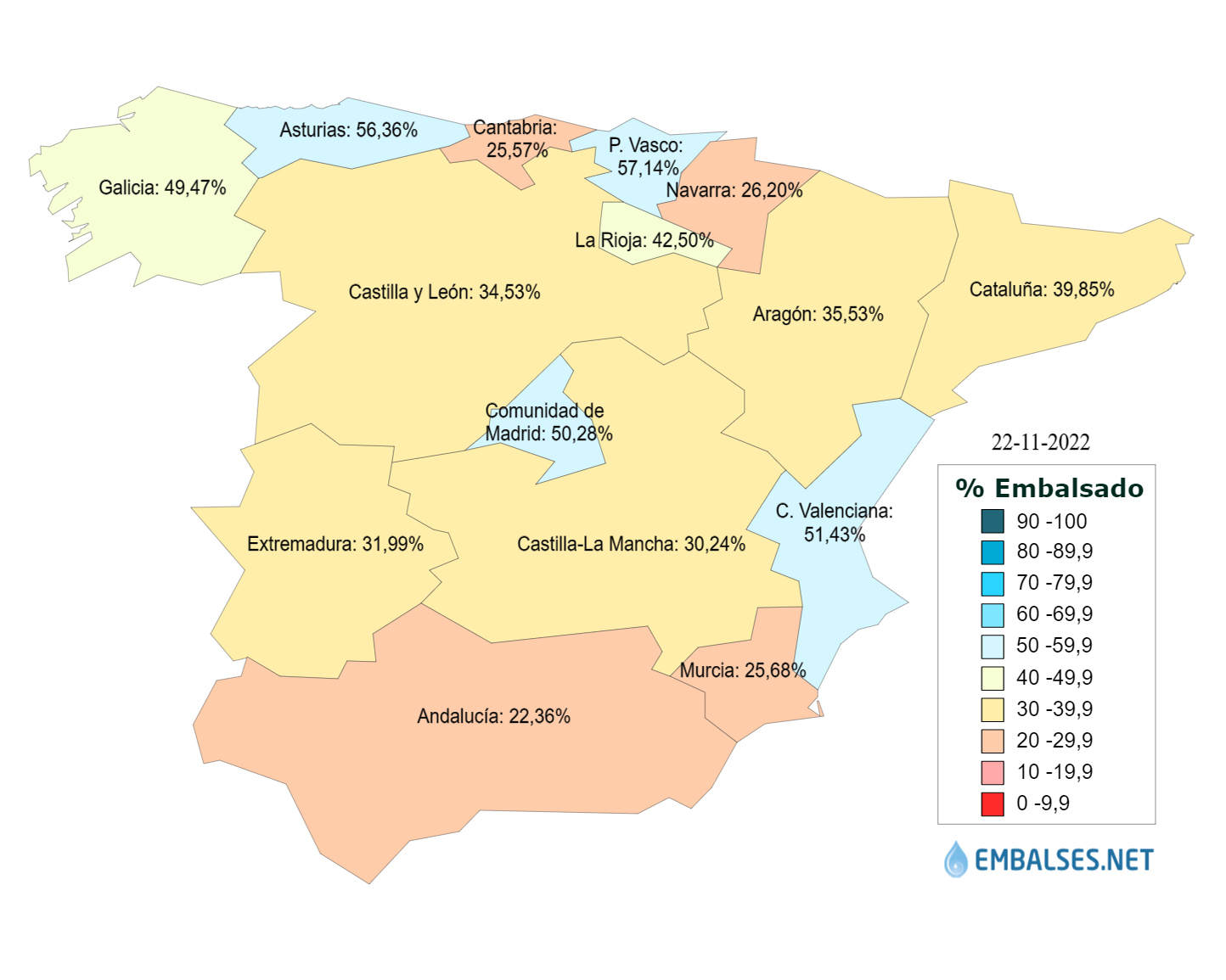 Entre el 30 y el 49% de su capacidad, están las cuencas del Miño-Sil, al 45,1%; Tajo, al 38,8%; Ebro, al 35,4%; Duero, al 34,3%; Cuenca Mediterránea Andaluza, al 33,9%; Cuencas internas de Cataluña, al 33,8%; y cuenca del Segura al 32,6%