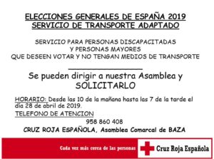 La Cruz Roja de Baza volverá a ofrecer su servicio de transporte a personas mayores y discapacitados en la jornada electoral. La Asamblea Comarcal de Cruz Roja Española en Baza, con motivo de las Elecciones Generales de España, que se celebrarán el próximo día 28 de abril de 2019, pone a disposición de los interesados con alguna discapacidad o personas mayores, el medio de transporte adaptado a su situación personal.