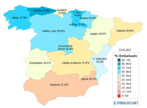 En cuanto a la reserva por ámbitos, la situación ordenada de mayor a menor cantidad de agua almacenada en las diferentes cuencas, es la siguiente: En torno al 60% o más de su capacidad están la Cuenca Cantábrico Oriental al 90,4%, Cantábrico Occidental al 86,9%, Cuencas internas del País Vasco al 85,7%, Galicia Costa al 84,1%, Miño-Sil al 72,6%, Tinto, Odiel y Piedras al 68,6%, Duero al 65,8%