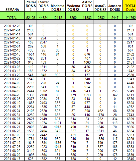 Continúan creciendo las cifras de vacunación en el AGS Nordeste, con la administración de 3.545 dosis en la semana del 17 de agosto. Nuevas dosis administradas, que elevan el total a 141.762 y que no incluyen a 4.044 casos de personas que no han sido revacunadas, destacando también que ha sido una semana en la que se volvía a repetir un notable descenso de las dosis suministradas, tras unas semanas en las que se superaban las 6.000 dosis y hasta se llegó a superar la cifra de 9.000.