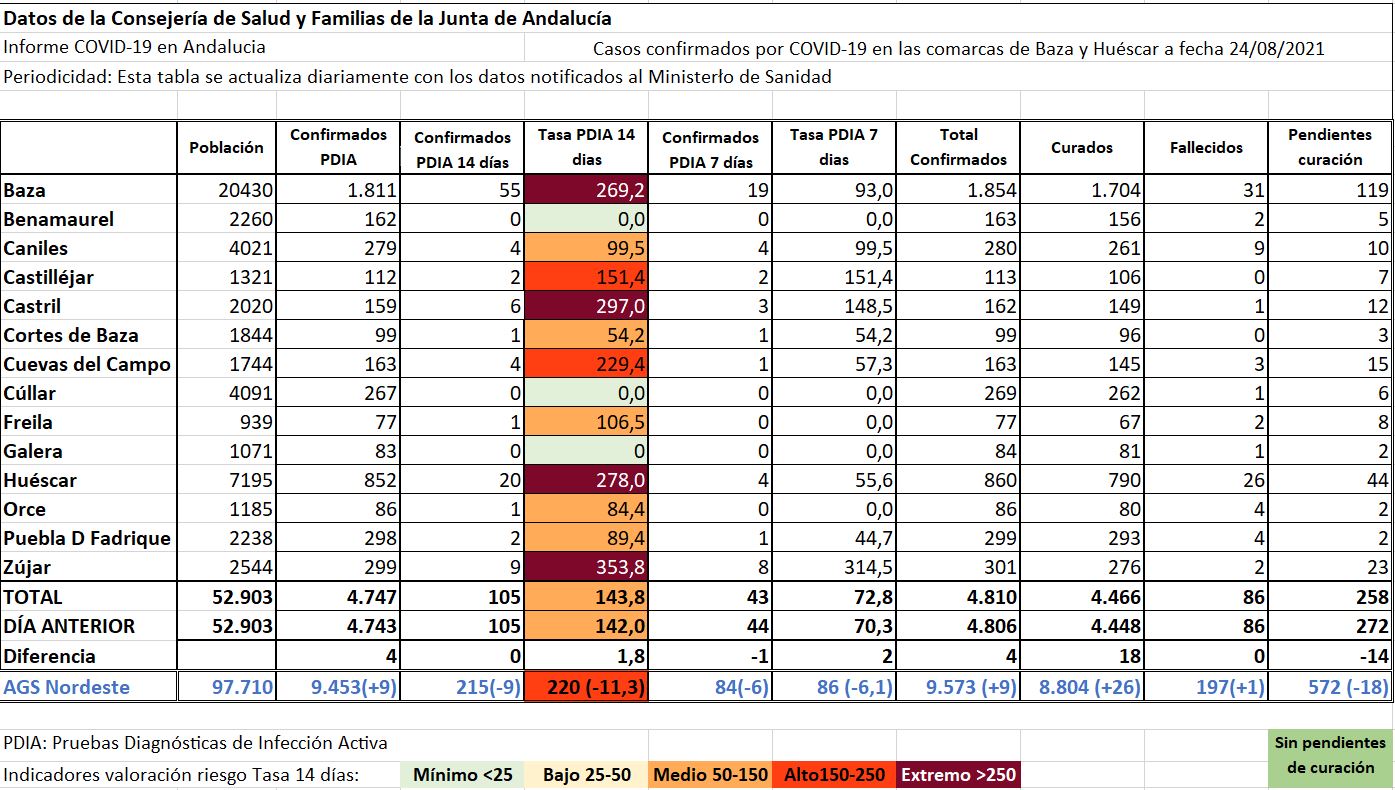 Por lo que respecta al conjunto del AGS Nordeste de Granada, ayer se añadían 9 casos nuevos de Covid, a pesar de lo que la tasa de incidencia a 14 días bajaba más de 11 puntos y la de 7 días lo hacía en la mitad, aumentando en 26 los casos de personas que recibían el alta y rebajando a 258 las que permanecen en espera de su curación en las comarcas de Baza, Huéscar y Guadix, donde se han confirmado, desde el inicio de la pandemia, un total de 9.573 casos de Covid, desde el inicio de la pandemia.