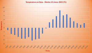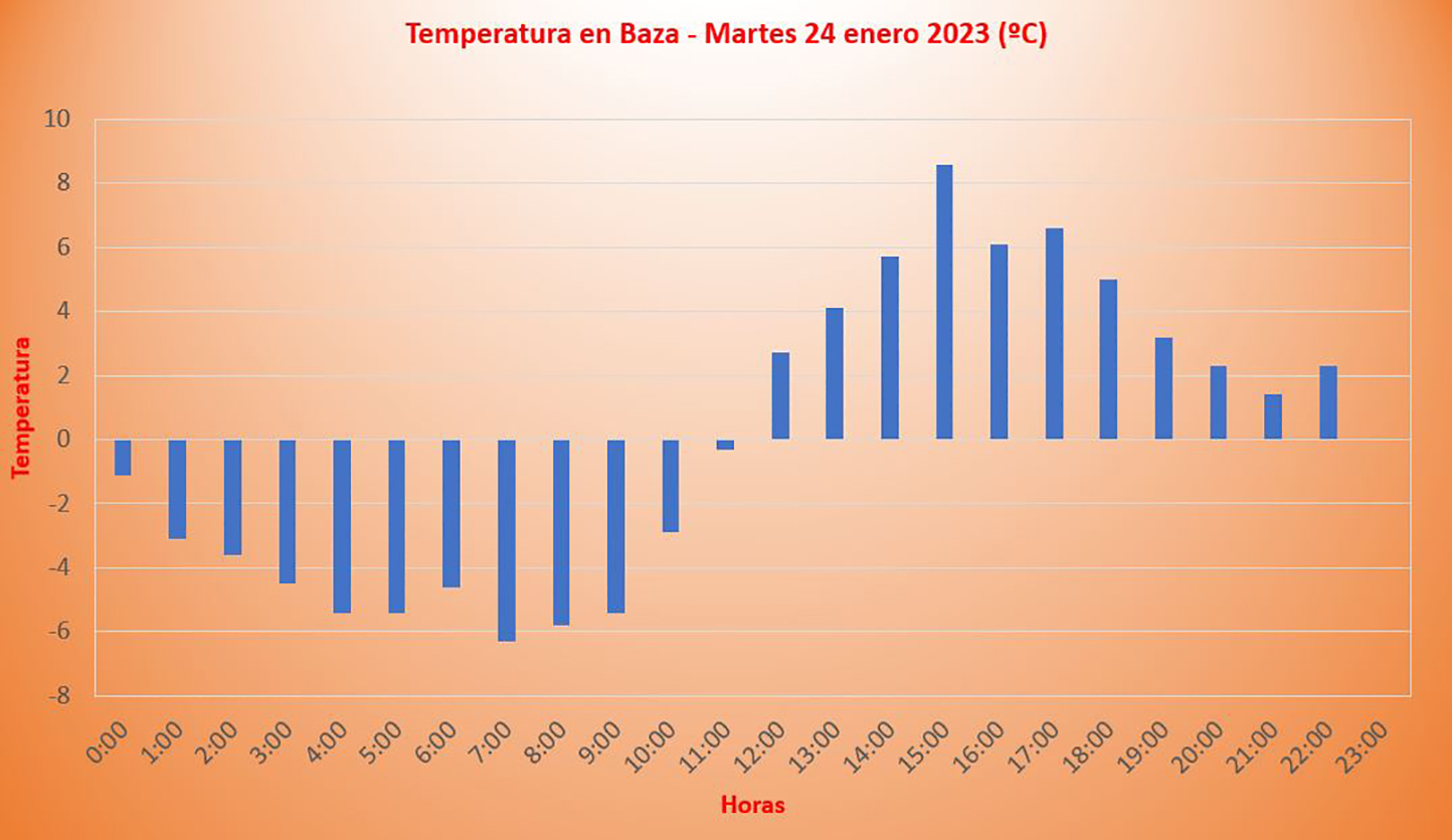 Ayer registraba Baza la temperatura más baja de toda Andalucía, con -6,3ºC a las siete de la mañana, permaneciendo bajo cero durante las 12 primeras horas del día. Como venimos informando en los últimos días, el frío se h instalado en nuestra ciudad y ayer nos daba buen muestra de ello, al registrar la temperatura más baja de toda Andalucía, cuando a las 7 de la mañana el termómetro registraba 6,3 grados bajos cero. Una temperatura que no se produjo en ninguna otra ciudad andaluza, si bien en Sierra Nevada el termómetro aún bajó hasta los menos 3,8ºC.