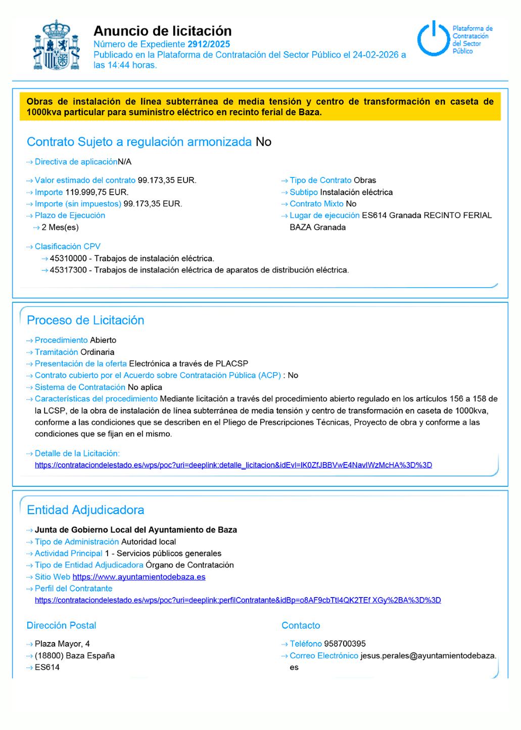 Sale a licitación el nuevo transformador destinado a instalarse para atender las necesidades del Recinto Ferial. El Ayuntamiento de Baza ha sacado a licitación pública las obras para la instalación de una nueva línea subterránea de media tensión y un centro de transformación en caseta de 1.000 kVA destinado al suministro eléctrico del Recinto Ferial del municipio.