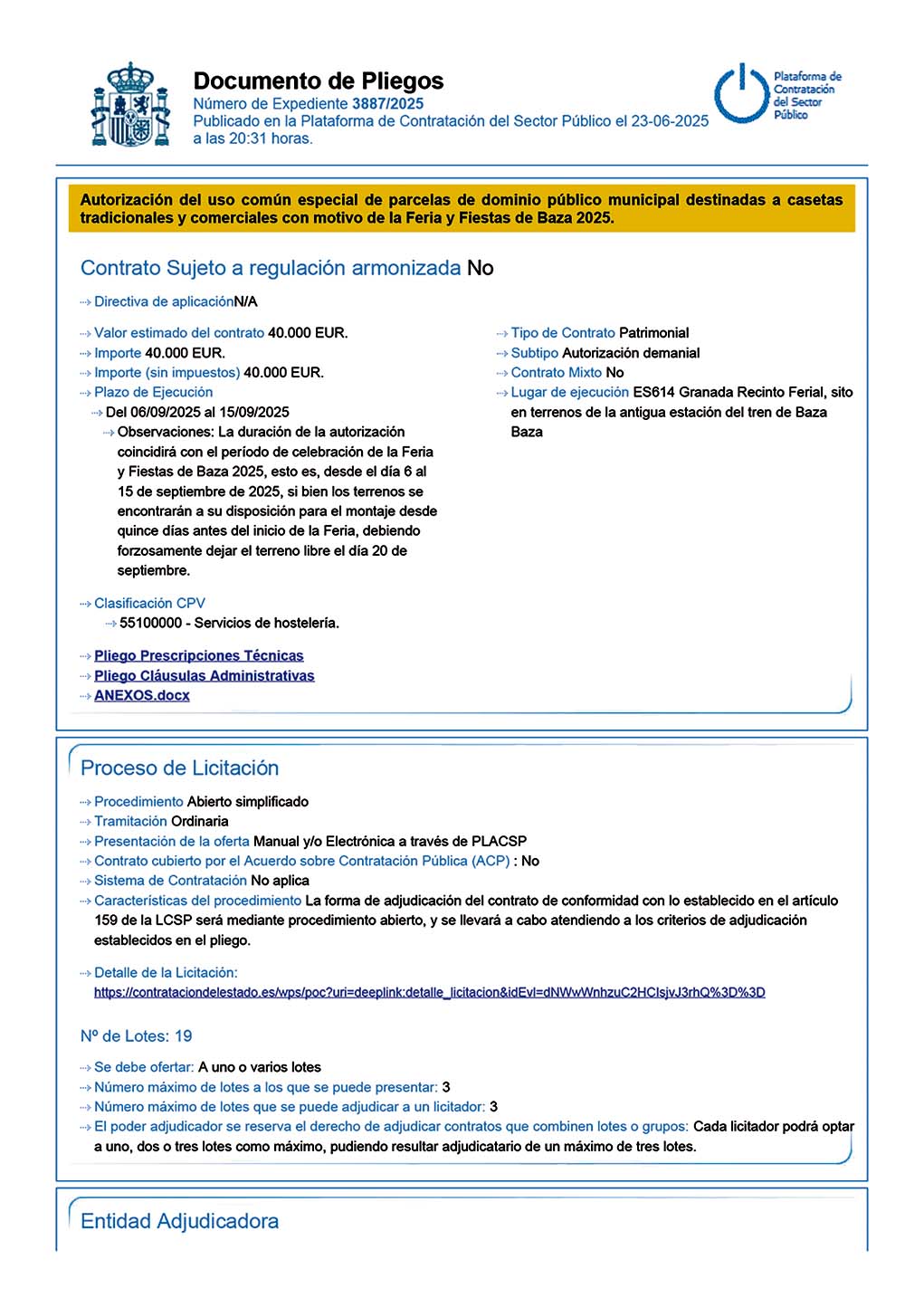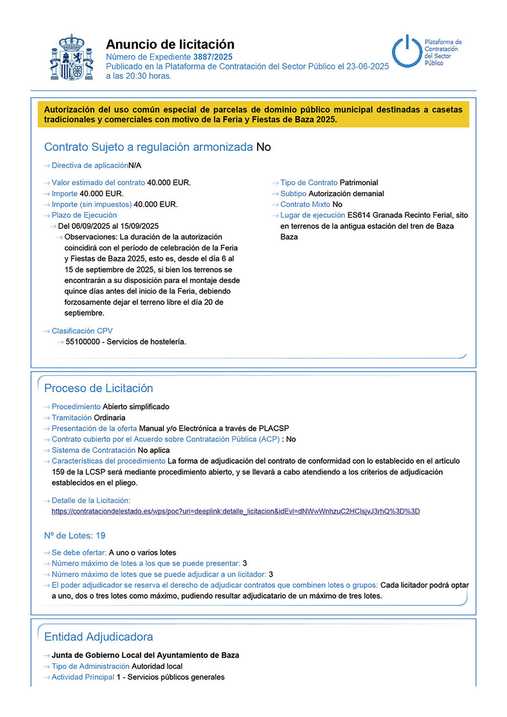 Abierto el plazo para solicitar parcelas de casetas en la Feria y Fiestas de septiembre de Baza. El Ayuntamiento de Baza ha abierto el proceso de licitación para adjudicar las parcelas destinadas a casetas tradicionales y comerciales con motivo de la próxima Feria y Fiestas de septiembre. El anuncio ya se encuentra publicado en la Plataforma de Contratación del Sector Público.