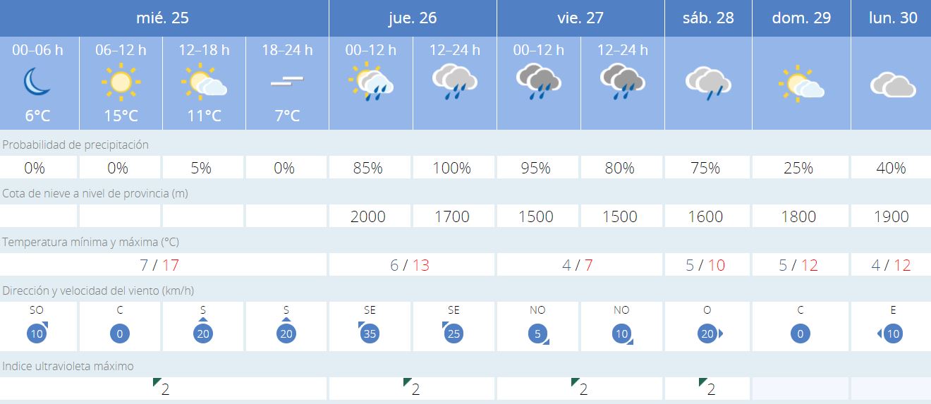 A destacar también la llegada de la lluvia, con unas jornadas del jueves y viernes que casi tiene garantía asegurada de que estarán pasadas por agua y que incluso podría ocurrir que empezaran a aparecer las nubes esta misma tarde, algo que será muy bien recibido en nuestros campos y que acabaría con una época de sequía que está afectando bastante a las reservas hídricas.