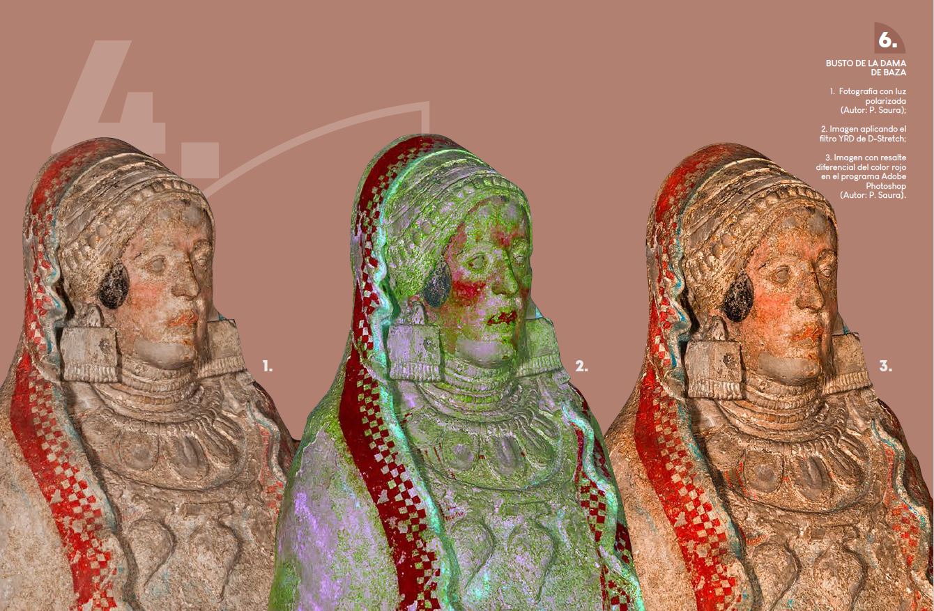 Además, se han venido realizando excelentes fotografías a la Dama de Baza, pero no ha sido hasta ahora cuando la fotografía digital y los programas utilizados para su estudio han permitido definir otros rasgos de color que en su inspección directa, solo llegaron ser citados como algunas “rayas rojas” entre los colgantes de los collares, “formando un trazado geométrico”, resultando ahora, gracias a estos estudios, que esa decoración como cordones rojos con cuentas o nudos, forman un dibujo sobre el lado derecho del busto y se prolongan bajo las lengüetas del collar, algo difícil de observar a simple vista y que hacen parecer que la Dama de Baza buscara aproximarse, lo más posible a su modelo humano, y que tanto su fisonomía como sus vestimentas y el trono en el que se sienta responderían a unas características reales.