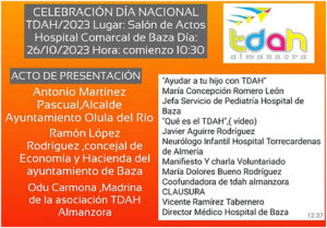 Durante la jornada se llevarán a cabo varias intervenciones en las que los asistentes podrán conocer más sobre este trastorno. “Ayudar a tu hijo con TDAH” será la primera conferencia, a cargo de María Concepción Romero León, Jefa del Servicio de Pediatría del Hospital de Baza. Se proyectará después el vídeo “¿Qué es el TDAH?”, protagonizado por Javier Aguirre, neurólogo infantil del Hospital Torrecárdenas de Almería. A continuación se leerá un manifiesto sobre este Día Nacional del TDAH y se iniciará una charla-debate en la que participará el voluntariado y la cofundadora de TDAH Almanzora, María Dolores Bueno. La clausura del acto vendrá a cargo del Director Médico del Hospital de Baza, Vicente Ramírez.