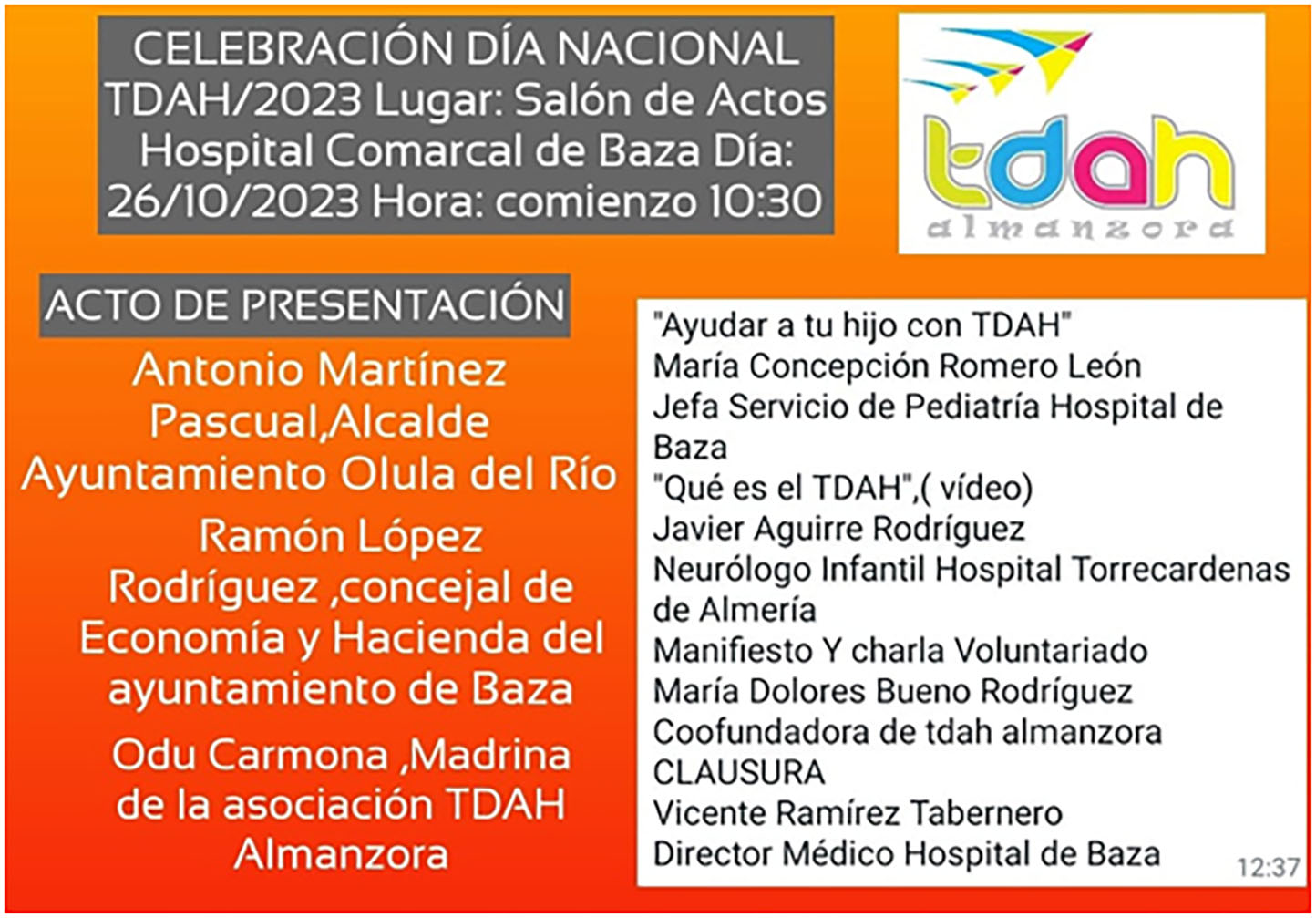 Durante la jornada se llevarán a cabo varias intervenciones en las que los asistentes podrán conocer más sobre este trastorno. “Ayudar a tu hijo con TDAH” será la primera conferencia, a cargo de María Concepción Romero León, Jefa del Servicio de Pediatría del Hospital de Baza. Se proyectará después el vídeo “¿Qué es el TDAH?”, protagonizado por Javier Aguirre, neurólogo infantil del Hospital Torrecárdenas de Almería. A continuación se leerá un manifiesto sobre este Día Nacional del TDAH y se iniciará una charla-debate en la que participará el voluntariado y la cofundadora de TDAH Almanzora, María Dolores Bueno. La clausura del acto vendrá a cargo del Director Médico del Hospital de Baza, Vicente Ramírez.