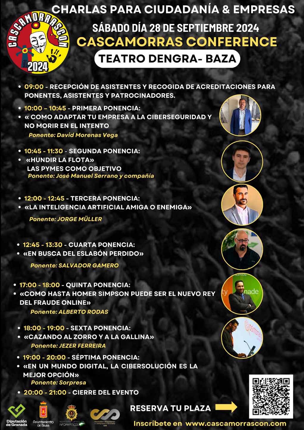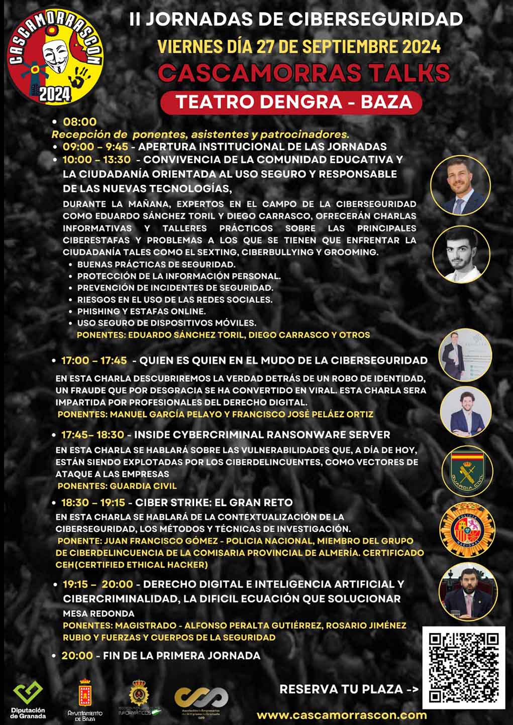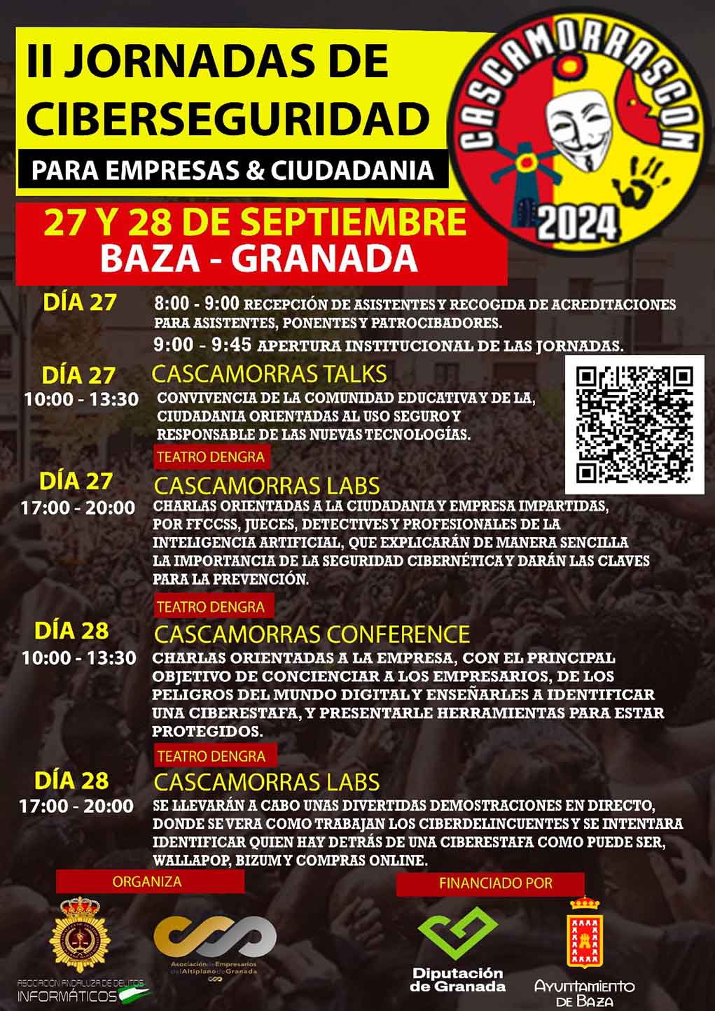 Baza acoge las II Jornadas sobre ciberseguridad, de la mano de CascamorrasCon, dedicadas a empresas y particulares, los días 27 y 28, viernes y sábado, y con acceso gratuito. En la mañana de ayer, el responsable de la CascamorrasCon, Javier Gavilán y el presidente de la Asociación de Empresarios del Altiplano, José Antonio Lucha, presentaban las Segundas Jornadas de Ciberseguridad e Inteligencia Artificial, dirigidas tanto a empresas como a la ciudadanía, se celebrarán en Baza durante el próximo fin de semana del 27 y 28 de septiembre, en el Teatro Dengra. El evento, denominado CascamorrasCon, se inspira en la emblemática Fiesta de Interés Turístico Internacional del Cascamorras, adaptando este evento al contexto de la ciberseguridad y la inteligencia artificial y con el objetivo coincidente de «hackear» a un personaje, con acciones realizadas con un sentido educativo y tecnológico.