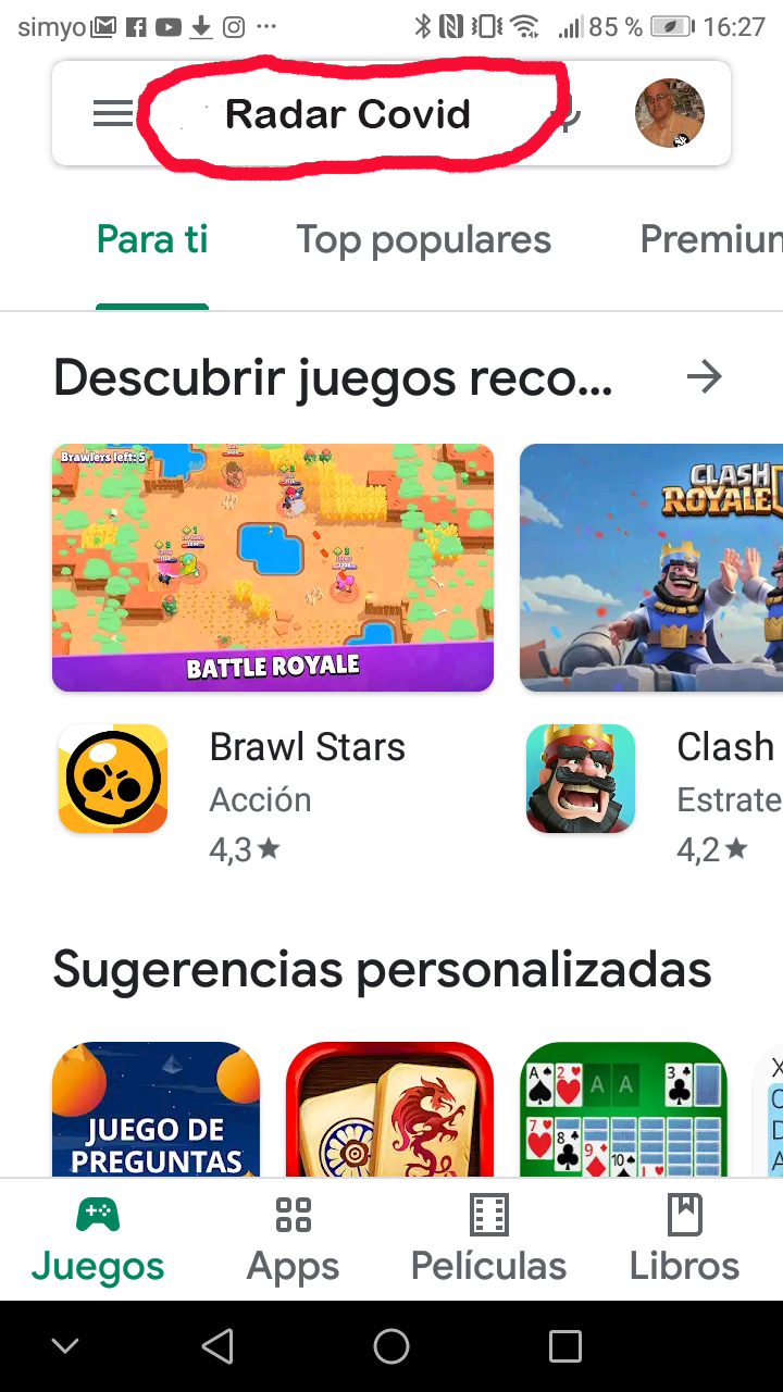 3 Escribir en la zona de búsqueda el nombre de la aplicación “Radar Covid” y buscar