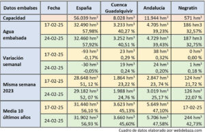 Por último, los datos del embalse del Negratín esta semana ha vuelto a su aumento más habitual, de 1 hm3, acumulando un total de 187 hm3, lo que supone una mejora de 0,18% en este nuevo ciclo semanal que se iniciaba el pasado lunes. A pesar de ello, supera con creces los 126 hm3 que tenía embalsados en la misma semana del pasado año, mientras que esa misma cifra es inferior en 57 hm3, si se compara con la media de la misma semana registrada durante los últimos diez años.