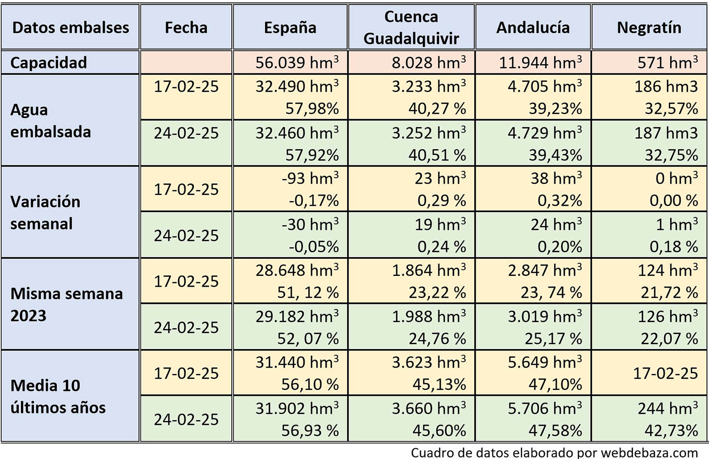 La reserva hídrica española al 57,92% de su capacidad tras una semana de descenso a nivel nacional, crecimiento en la cuenca del Guadalquivir y Andalucía y sin cambios en el Negratín. La reserva hídrica española está al 57,92% de su capacidad total y los embalses almacenan, a fecha del pasado lunes, 32.460 hectómetros cúbicos (hm³) de agua, disminuyendo en la última semana en 30 hectómetros cúbicos, que es el 0,05% de la capacidad total actual de los embalses. Comparadas estas cifras con las de la misma semana del pasado año, la actual cantidad de agua es superior en 3.278 hm3, y supera también a la de la misma semana de la media de los últimos diez años, cuando había almacenados 558 hm3 menos.