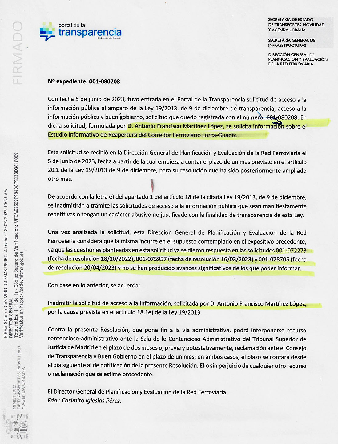 El Ministerio de Transportes, por medio D. Casimiro Iglesias Pérez (Director General de Planificación y Evaluación de la Red Ferroviaria), ha denegado la petición de información sobre la situación actual de los trabajos del Estudio Informativo de reapertura de la línea férrea Guadix Baza Almanzora Lorca (Corredor Lorca-Guadix) realizada en Junio de este año por Antonio Fco. Martínez López en nombre de la asociación Amigos del Ferrocarril Comarca de Baza y de la plataforma Comarca de Guadix por el Tren.