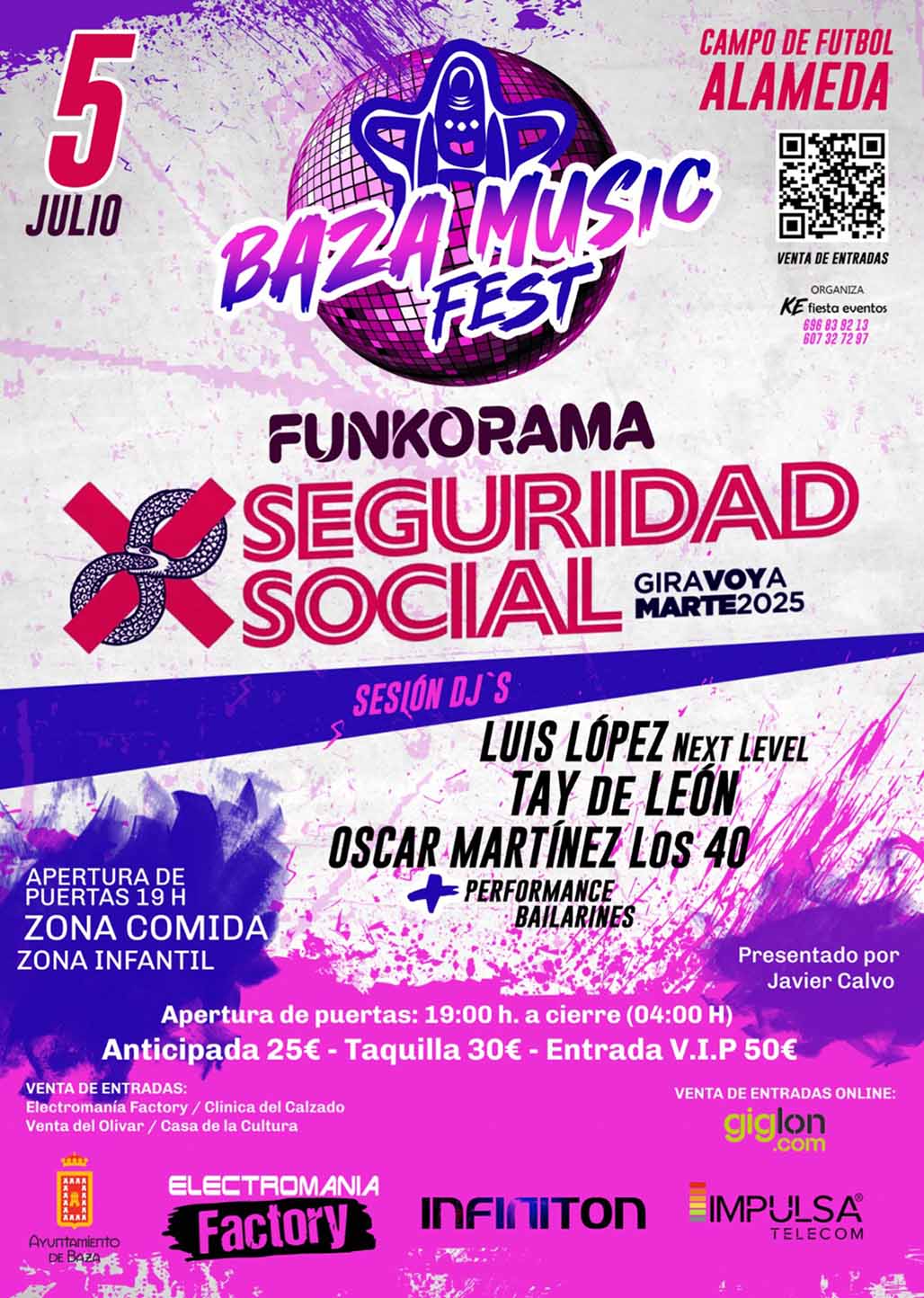 El Baza Music Fest 2025 se celebrará el 5 de julio en el campo de fútbol de la Alameda. El campo de fútbol de la Alameda acogerá el sábado 5 de julio la segunda edición del Baza Music Fest, un evento que contará con la actuación en directo de los grupos «Seguridad Social»», que interpretará temas de su gira «Voy a Marte». También participará el grupo «Funkorama», junto con los DJ´s Luis López, Tay de León y Óscar Martínez, en un evento que será presentado por Javier Calvo y cuya organización corre a cargo de la empresa bastetana «KE Fiesta Eventos»