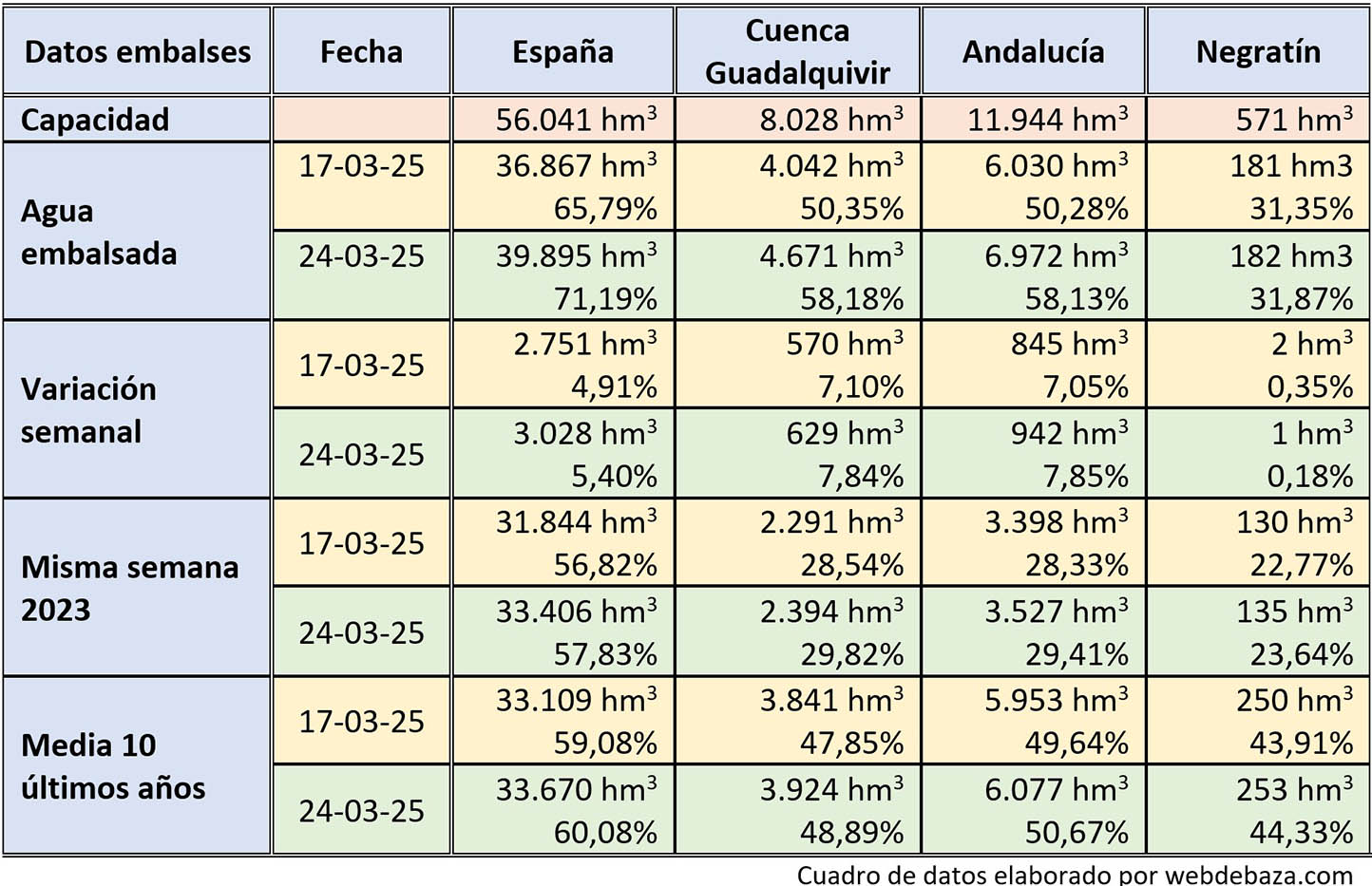 La reserva hídrica española se encuentra al 71,2% de su capacidad y solo con la cuenca del Segura por debajo del 50%, mientras que el Negratín está al 31,87%. Actualmente, con datos del pasado lunes, la reserva hídrica española es de 39.895 hectómetros cúbicos, lo que equivale al 71,19% de su capacidad total, algo que supone un aumento en la última semana de 3.028 hm3 que equivalen al 5,4% de la capacidad total actual de los embalses. Comparadas estas cifras con las de la misma semana del pasado año, la actual cantidad de agua almacenada es superior en 7.489 hm3 y supera también a la media de los últimos diez años de la misma semana, cuando se habían almacenados 6.225 hm3 menos, tras otra semana en la que se han aumentado estas diferencias.