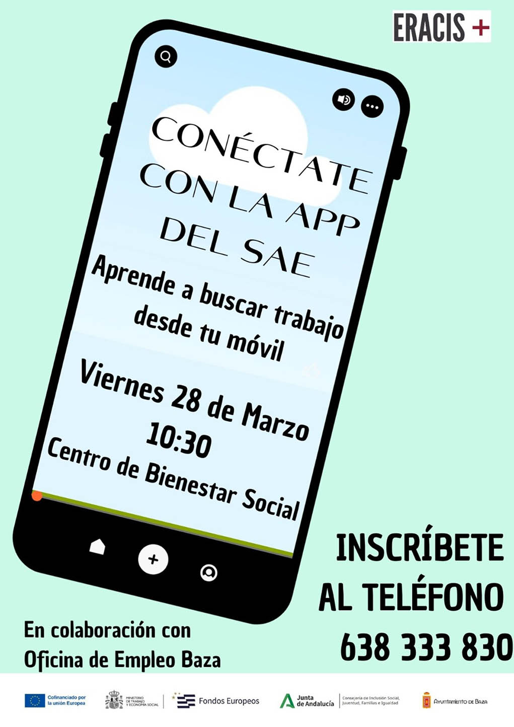 El Programa ERACIS+ facilita el aprendizaje para actuar con la APP del SAE y facilitar la búsqueda de empleo. En un mundo laboral cada vez más digitalizado, contar con herramientas efectivas para la búsqueda de empleo es clave. Con esta premisa, el Programa ERACIS+, cofinanciado por el Fondo Social Europeo Plus y la Consejería de Inclusión Social, Juventud, Familias e Igualdad de la Junta de Andalucía, trabaja para mejorar la empleabilidad de sus participantes en estrecha coordinación con los recursos de empleo del municipio.