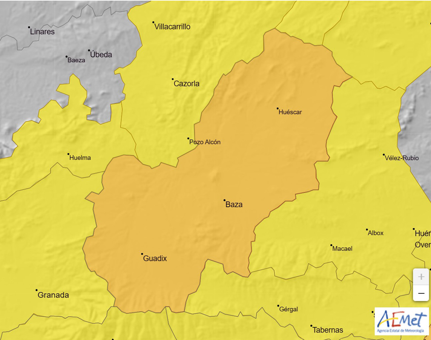 En definitiva, una situación que llevaba a la Agencia Estatal de Meteorología, AEMET, a elevar a naranja su previsión inicial de alerta amarilla que estaba vigente en las comarcas granadinas de Baza, Huéscar y Guadix, el cual permaneció activo hasta la medianoche. En principio, la previsión de AEMET calculaba una acumulación de nieve en 24 horas de seis centímetros, por encima de los 900 o 1000 metros en estas comarcas, en las que también se activó hasta la medianoche el aviso amarillo por viento, por rachas de hasta 70 kilómetros hora.