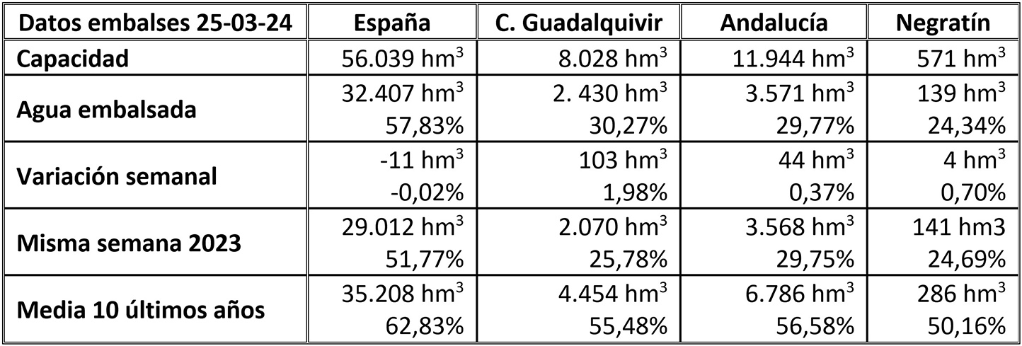 manera holgada, si bien está muy lejos de llegar a la media registrada en la misma semana de los últimos diez años. También la Comunidad de Andalucía mejora ya los datos del 2023, pero mantiene una diferencia similar con la media del decenio, mientras que el embalse del Negratín, que volvía a mejorar en 4 hm3, está próximo a alcanzar el 25% de su capacidad total, algo que podría ocurrir en los próximos días, dado que las lluvias y nieves de los últimos días tienen mucho que aportar al pantano