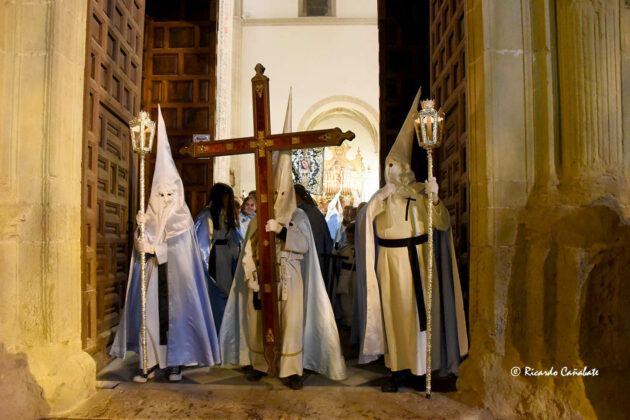 La Hermandad de la Santa Cruz se vio obligada a retornar a su iglesia, tras apenas pisar la Plaza Mayor, porque esta vez sí llegó la lluvia. Con una puntualidad exquisita, la Hermandad de la Santa Cruz asomaba su Cruz de Guía a la Plaza Mayor, en una noche en que las previsiones volvían a anunciar lluvia, pero en la que se confió que su cortejo sería respetado, para lo que además ya se había acordado un recorte de itinerario, al llegar a la Plaza de San Francisco, para dirigirse de nuevo a su iglesia por el Carril.