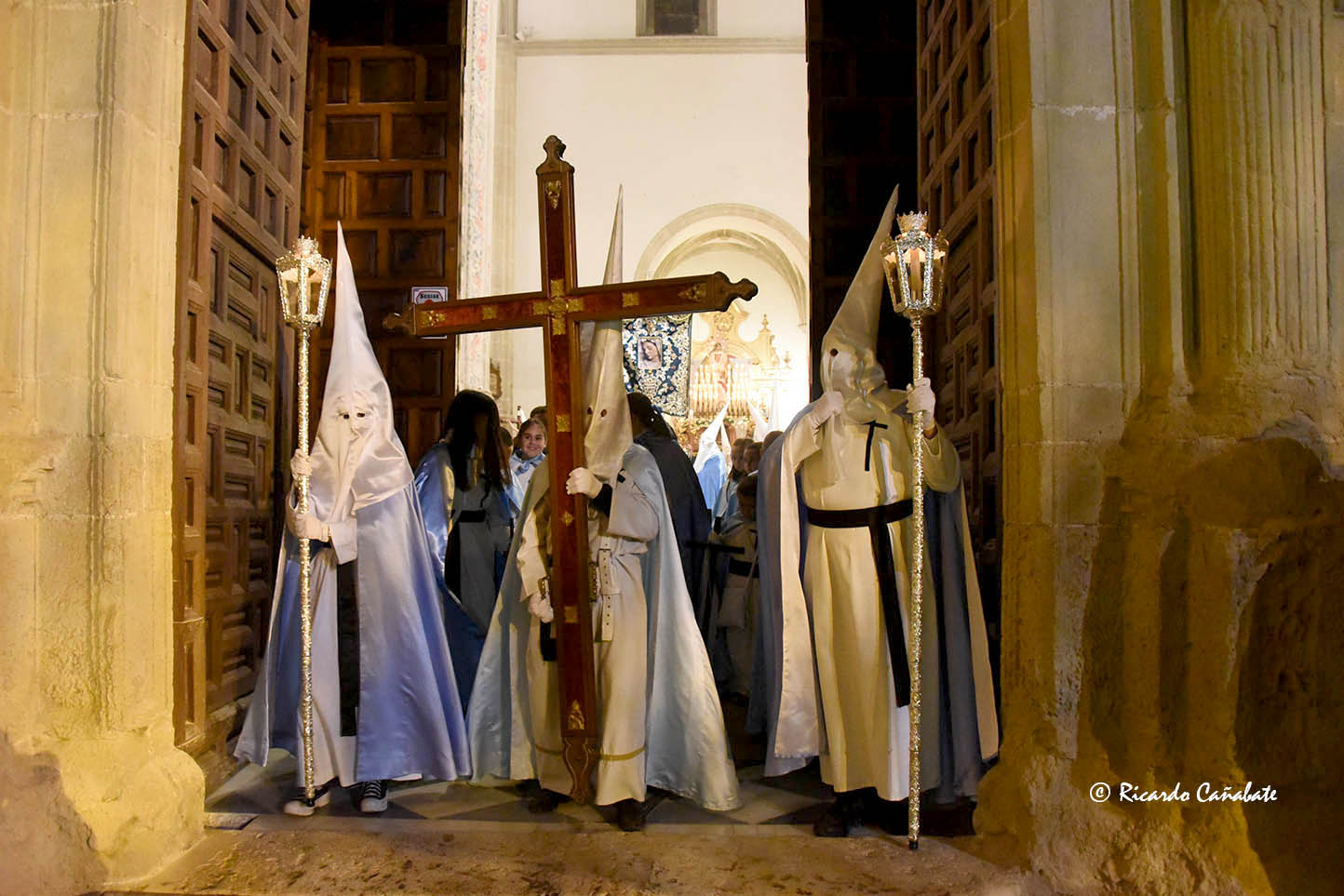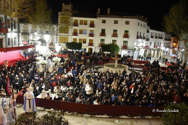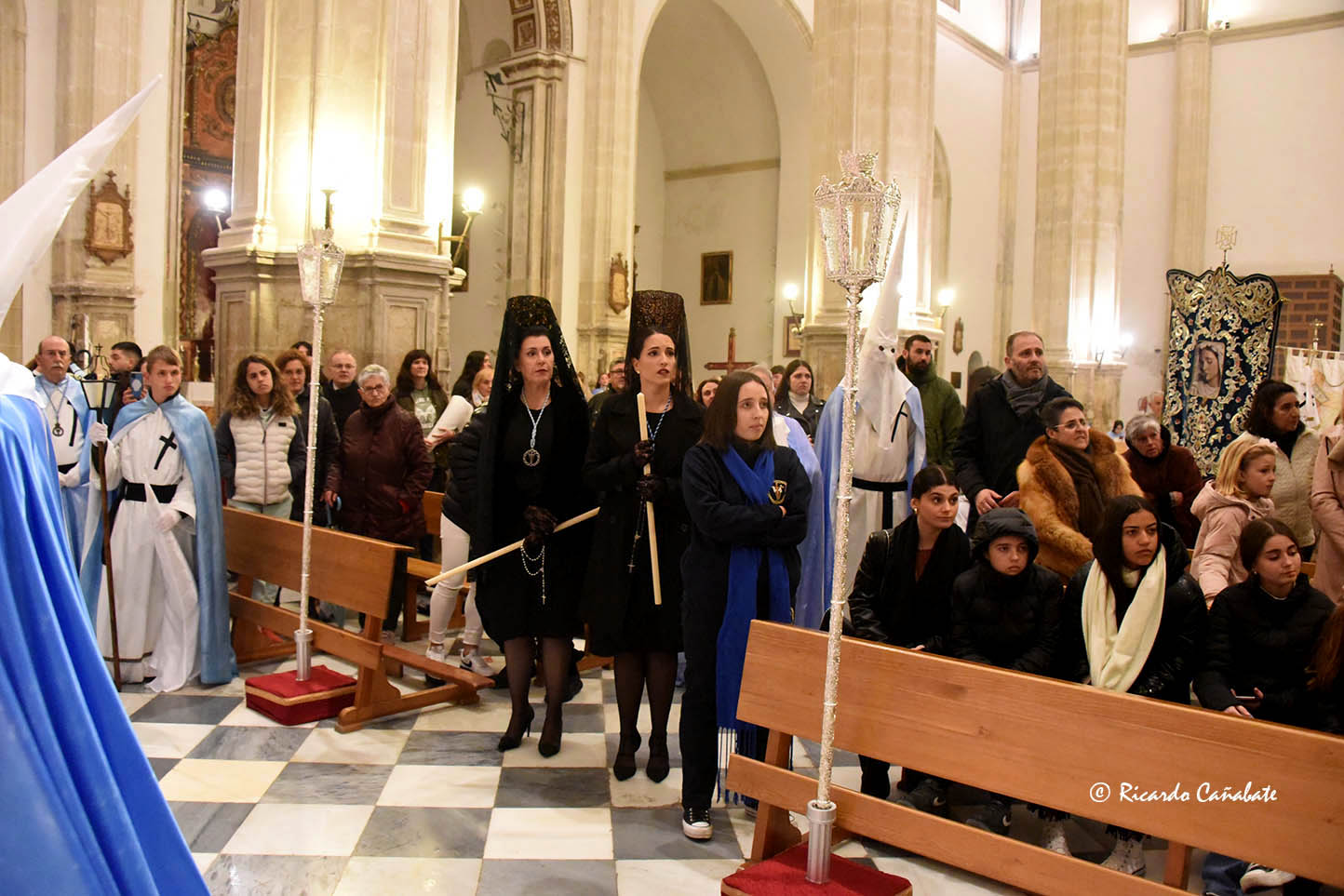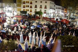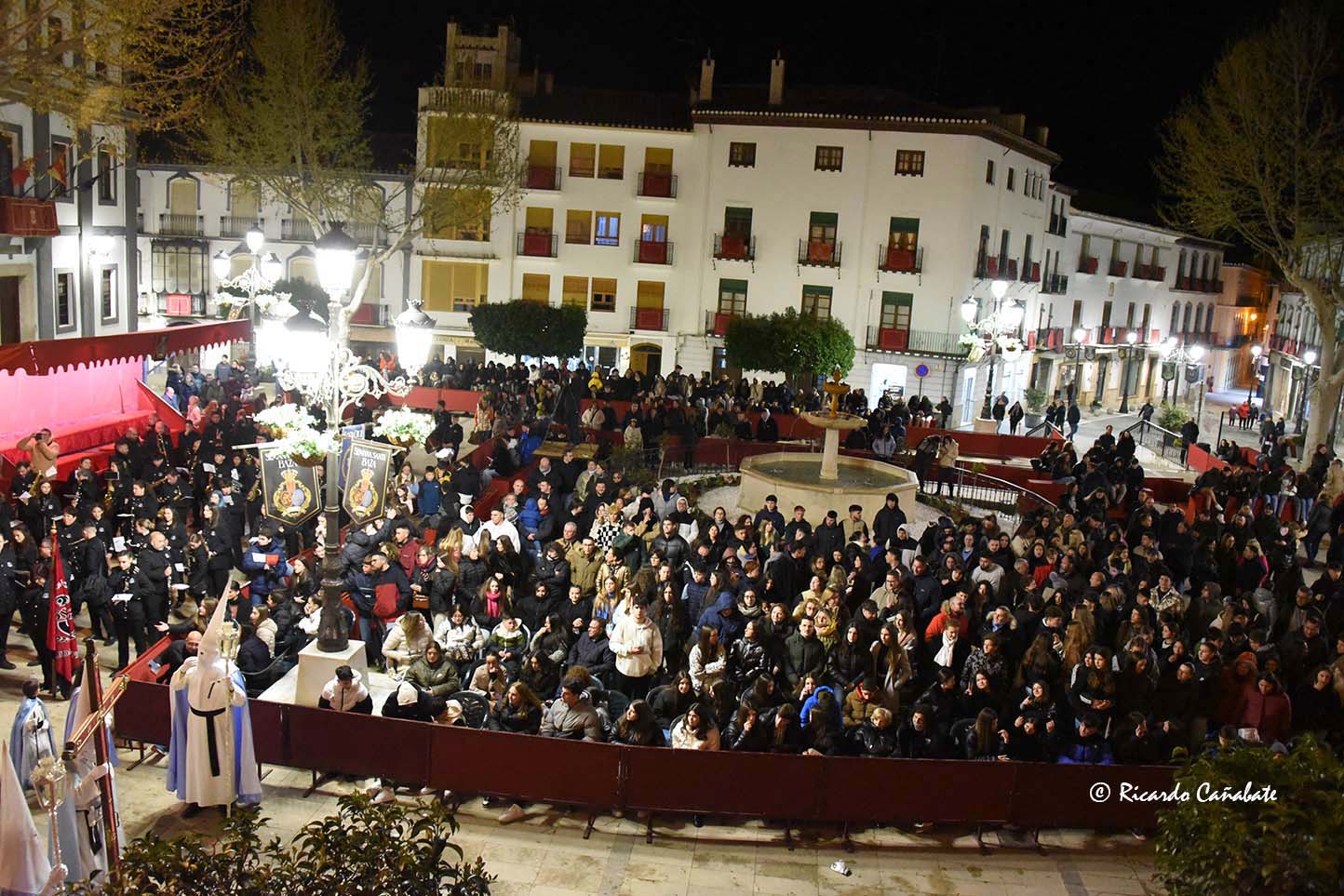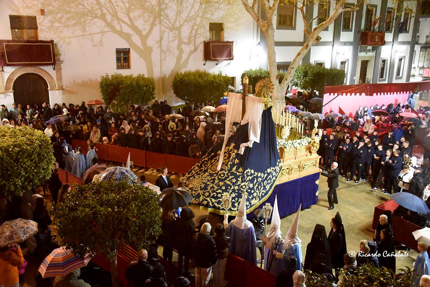 En una Plaza Mayor, con algo menos de público que en ocasiones precedentes y en una noche en la que el frío se dejaba notar, también se notaba la ilusión por ver que las puertas se habían abierto y que todo empezaba a marchar. Sin embargo, apenas acababa de bajar el paso la rampa de acceso a la iglesia, la lluvia iba a más y daba sensación de que esta vez iba en serio. Aún así, se llegó a enfilar la calle Alhóndiga, mientras que el paso llegaba a la altura de la calle de la Tribuna Oficial y ahí no esperó más la decisión: había que darse la vuelta, lo que se hizo saber a penitentes y mantillas que, con paso ligero pero sin descomponerse, retornaban a la iglesia, mientras los costaleros dejaban el sitio a la cuadrilla de mujeres, la banda de música abandonaba su lugar para irse en busca de refugio y el paso giraba para encarar hacia el camino de vuelta, marchando con el mismo señorío con el que había salido y entrando en el templo al son de un atronador aplauso, que se fue repitiendo en diferentes ocasiones.