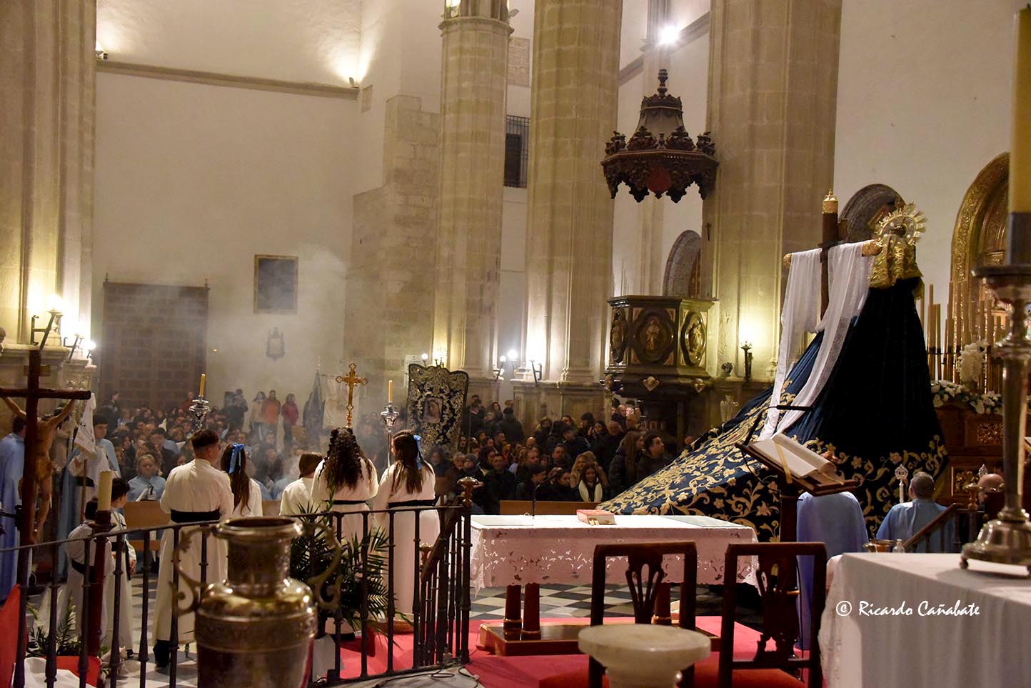 Con la iglesia a rebosar, el consiliario, Manuel Millán, tomaba la palabra con tranquilidad y mucho tacto, para poner orden y comentar que la procesión seguiría con el acto que se iba a celebrar dentro de la iglesia, la cual estaría abierta “mientras quede aquí una sola persona”. Una iglesia donde se siguió con sumo respeto el acto anunciado y donde no solo era difícil encontrar un hueco, sino incluso atravesar algunas de las capillas.