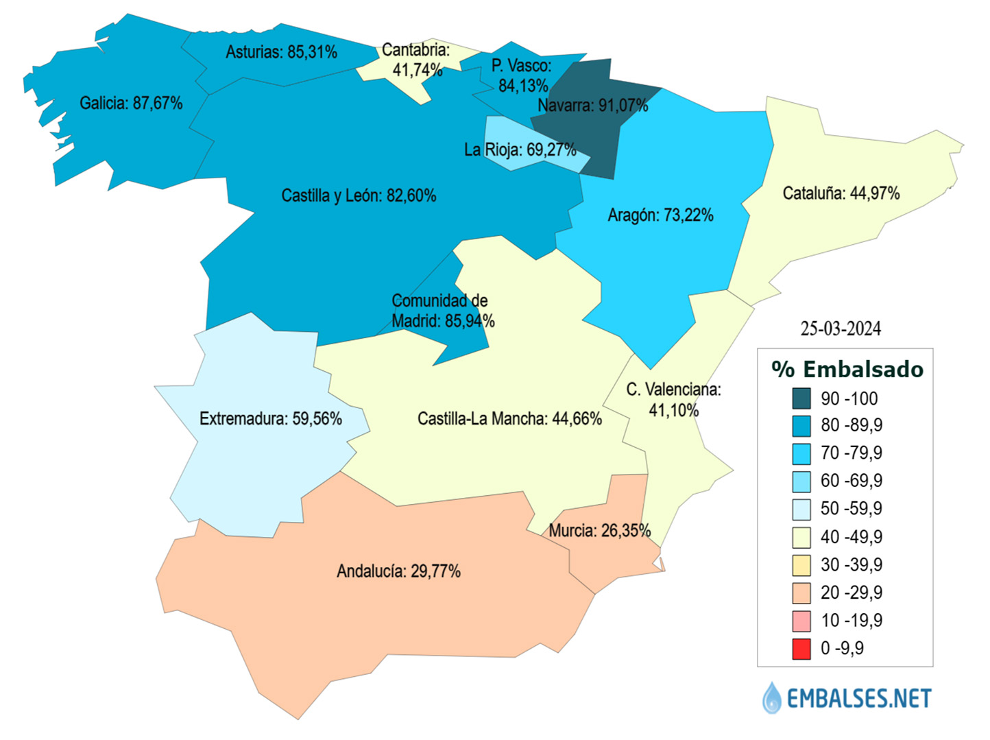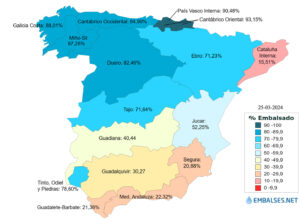 Por encima del 60% están los embalses de las Cuencas del Cantábrico Oriental que se encuentra al 93,2%, Cuencas internas del País Vasco al 90,5%, Galicia Costa al 88%, Miño-Sil al 87,3%, Cantábrico Occidental al 84,9%, Duero al 82,5%, Tinto, Odiel y Piedras al 78,6%, Tajo al 71,6% y Ebro al 71,2%