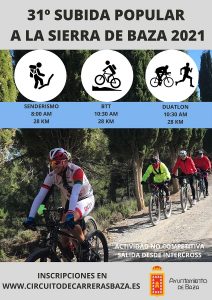 Se trata de una prueba popular no competitiva, para la que se pueden formalizar las inscripciones en  www.circuitodecarrerasbaza.es o en el siguiente enlace: https://www.cruzandolameta.es/ver/31a-subida-a-la-sierra-de-baza-2021—1430/