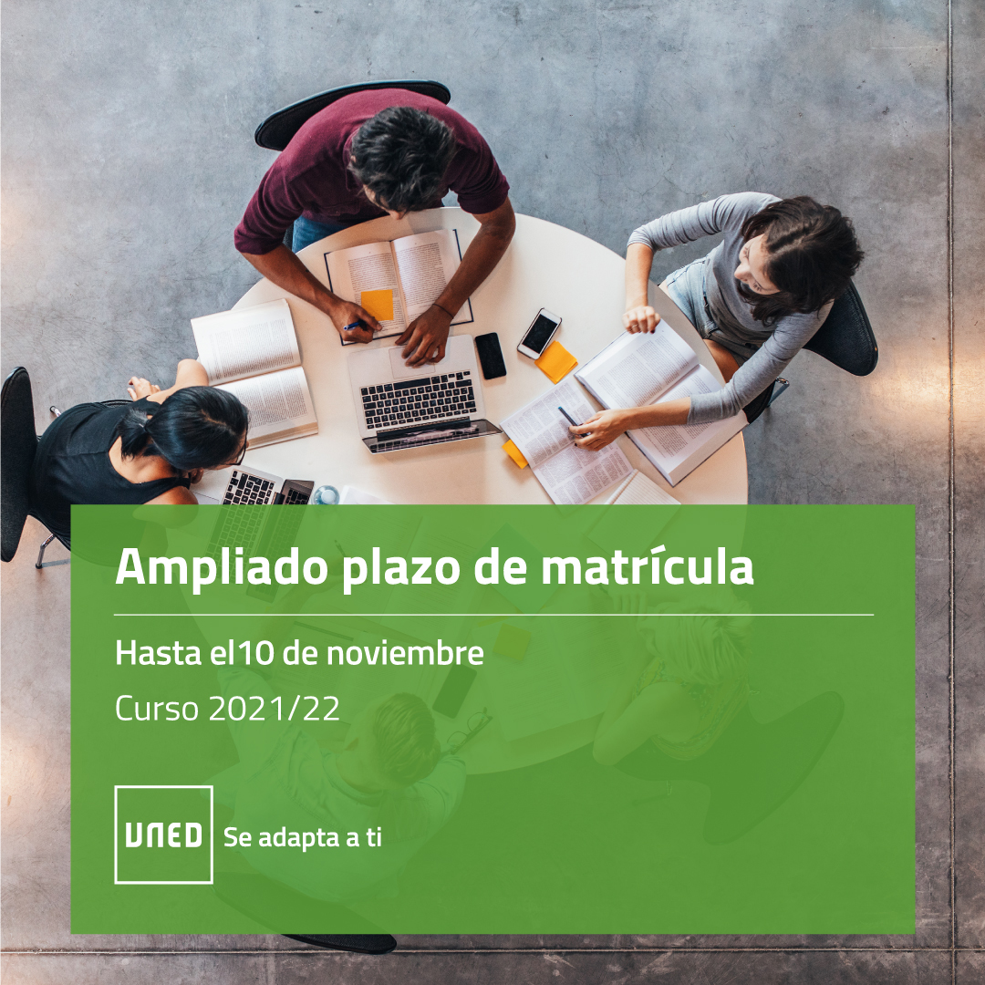 La UNED ha ampliado el plazo de matrícula para los estudios de Grado, Grados Combinados, Másteres Oficiales, Centro de Idiomas (CUID), Curso de Acceso para Mayores de 25 y 45 años y Microtítulos hasta el próximo 10 de noviembre. Además, permanecen abiertos los periodos de matriculación de la Escuela Internacional de Doctorado hasta el 17 de noviembre, y de Formación Permanente y Profesional hasta el 30 de noviembre en plazo ordinario y hasta el 17 de enero de 2022 en periodo extraordinario. De esta forma, la universidad quiere facilitar el acceso a la Educación Superior universitaria a todos aquellos interesados en completar su formación. El proceso de matrícula se realiza de forma totalmente online.