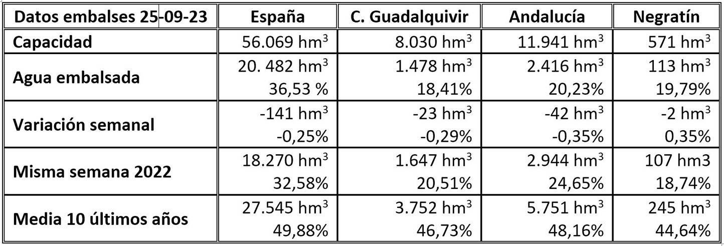 En la fecha citada, la reserva hídrica española estaba en 20.482 hm3 al 36,53% por ciento de su capacidad total, lo que supone un descenso inferior al de siete días antes, pero habiendo perdido 141 hm3 que equivalen a un 0,25% de su capacidad; los de la Cuenca del Guadalquivir almacenaban el pasado lunes 1.478 hm3 equivalentes a un 18,41%, tras una pérdida de 23 hm3; los de la Comunidad de Andalucía 2.416 hm3 que suponen un 20,23% y una pérdida de 42 hm3, mientras que a nivel más cercano, el embalse del Negratín, 113 hm3 que son un 19,79% del total de su capacidad, tras haber perdido otros 2 hectómetros cúbicos en la última semana, que le han hecho volver a bajar del 20% su cantidad de agua embalsada, algo que se ha repetido a todos los niveles..