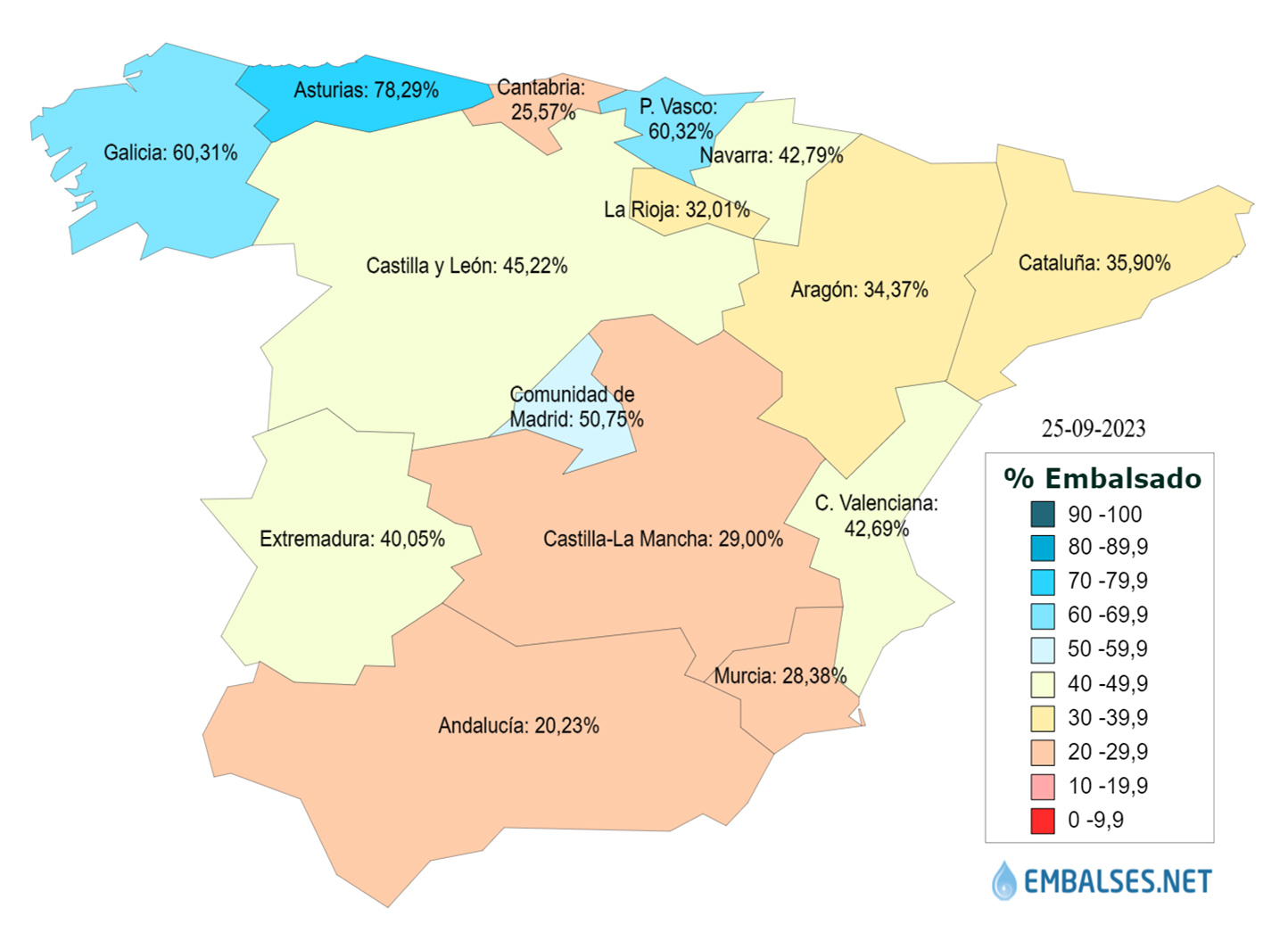 Entre el 60% y el 30%, las cuencas de Galicia Costa al 56,9%, Tinto, Odiel y Piedras al 55%, Tajo al 48,3%, Júcar al 48%, Duero al 44,4% y la Cuenca del Ebro al 36,5%,