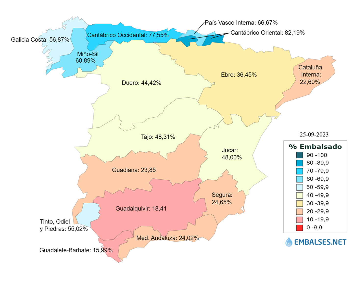 En el otro extremo, y por debajo del 30% está la cuenca del Segura al 24,6%, Cuenca Mediterránea Andaluza al 24%, Guadiana al 23,8%, Cuencas internas de Cataluña al 22,6%, Guadalquivir al 18,4% y Guadalete-Barbate al 16%.