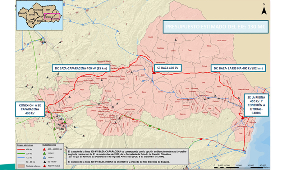 Una infraestructura que incluye la construcción de la subestación eléctrica de ‘La Ribina’, en Antas, una línea de 400 kV que la conectará con la subestación de Baza y la línea eléctrica de 400 kV que suministrará energía a la futura línea de alta velocidad, por lo que Red Eléctrica Española ha iniciado los trámites administrativos previos correspondientes a la concesión de los permisos.