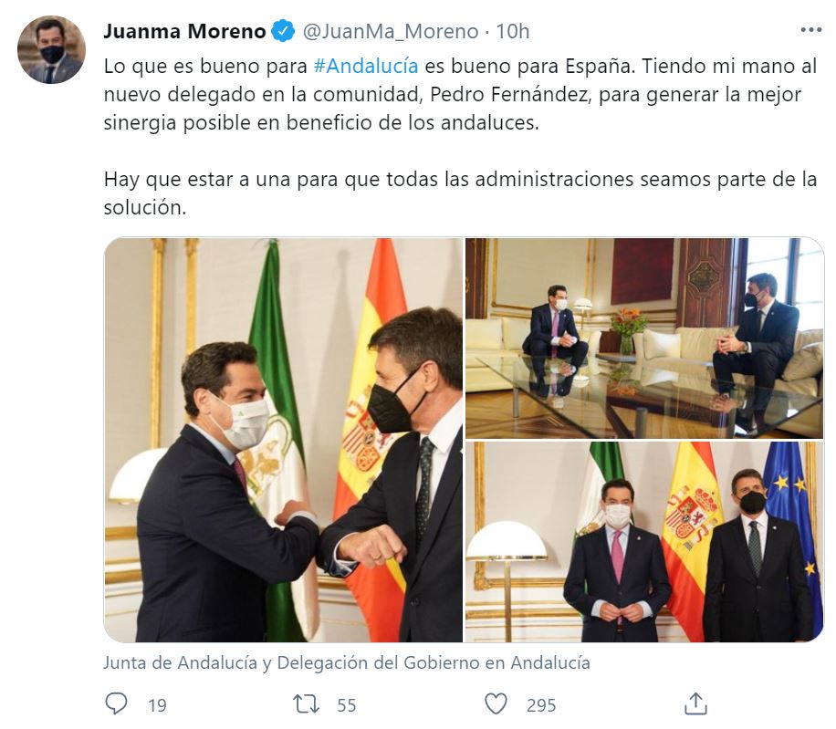 Twitteaba Moreno que “Lo que es bueno para #Andalucía es bueno para España. Tiendo mi mano al nuevo delegado en la comunidad, Pedro Fernández, para generar la mejor sinergia posible en beneficio de los andaluces.