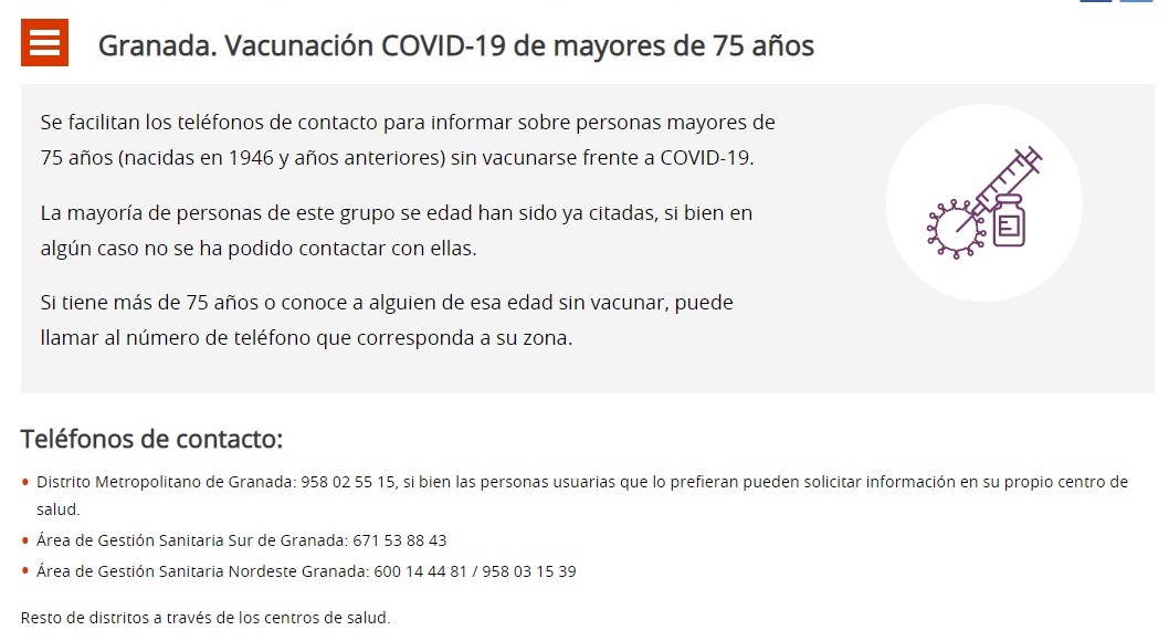 Los mayores de 70 años que aún no han sido vacunados pueden contactar con el SAS para pedir cita. Las áreas sanitarias y distritos de toda Andalucía, dependientes del Servicio Andaluz de Salud (SAS) y la Consejería de Salud y Familias de la Junta de Andalucía, ampliarán a partir de hoy la opción de recaptación a mayores de 70 años a través de los números de teléfono habilitados para tal efecto. En el caso del Área Sanitaria Nordeste de Granada, los teléfonos habilitados son el 600 14 44 81 y el 958 03 15 39 y los habituales de cada Centro de Salud.