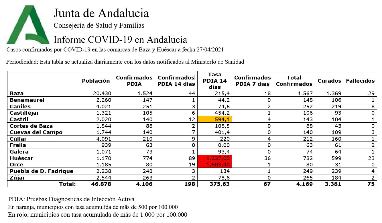 Y esta es la situación, a día de ayer, de los municipios de las comarcas de Baza y Huéscar: