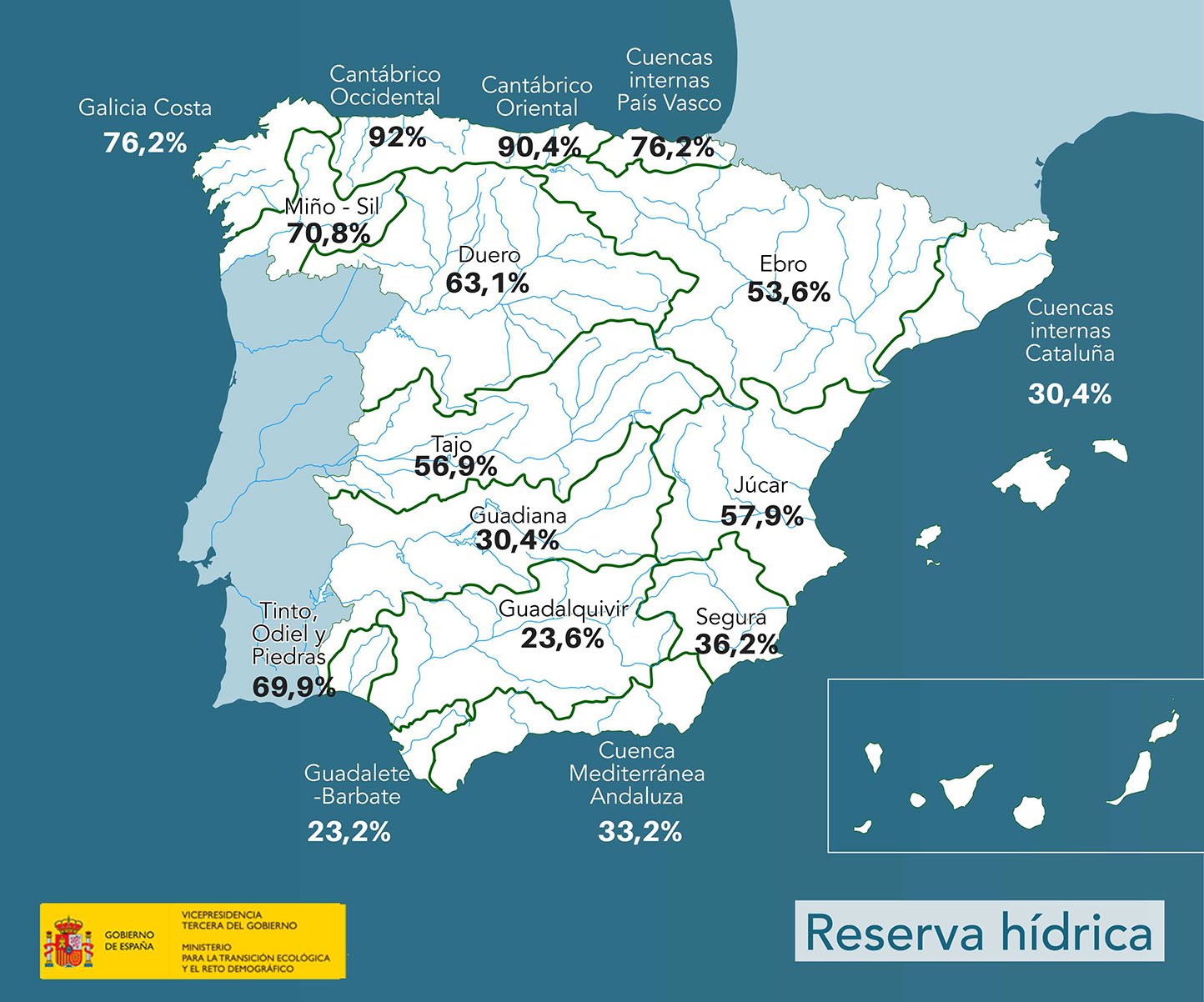 Las cuencas que se encuentran con un almacenamiento superior al 60% son: Cantábrico Occidental al 92 %, Cantábrico Oriental se encuentra al 90,4%, Galicia Costa al 76,2%, Cuencas internas del País Vasco al 76,2%, Miño-Sil al 70,8%, Tinto, Odiel y Piedras al 69,9% y Duero al 63,1%