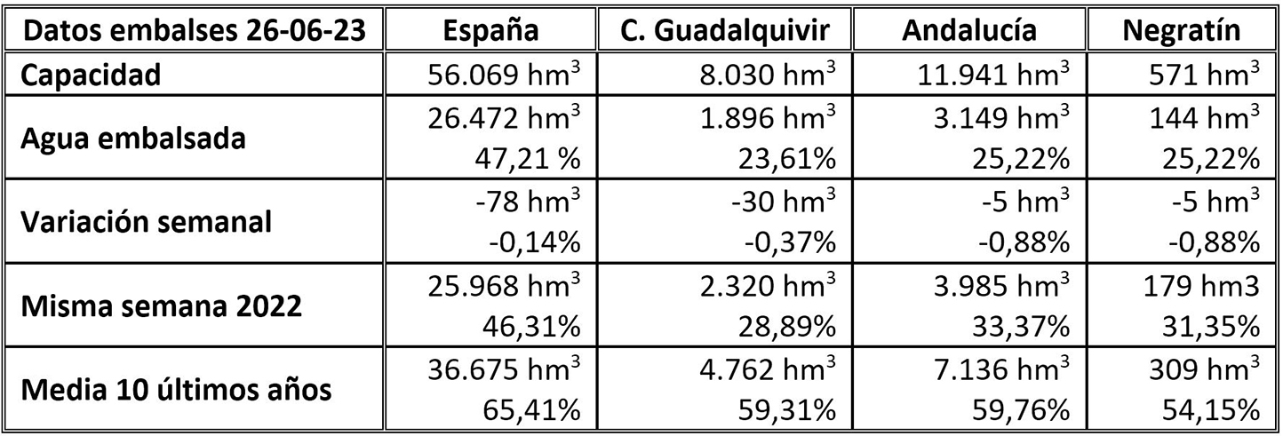La última semana empeoró sensiblemente el almacenamiento de agua en los embalses españoles y andaluces, así como en la cuenca del Guadalquivir y el Negratín. La llegada del calor a nuestro país ha supuesto una notable inversión en la tendencia a aumentar las reservas acuíferas en nuestros embalses, pues tanto a nivel nacional, como en la cuenca del Guadalquivir, la comunidad de Andalucía y, a nivel más próximo, el embalse del Negratín, se ha producido un importante descenso, hasta el punto que todos estos parámetros presentan un descenso del agua embalsada bastante significativo, con respecto a lo acumulado hace tan solo una semana.