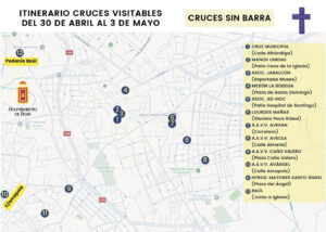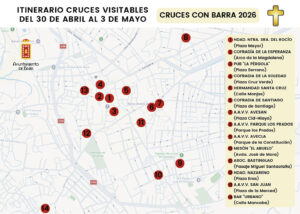 En esta edición, entre las cruces con barra figuran montajes promovidos por establecimientos, asociaciones vecinales y cofradías en enclaves como la avenida José de Mora, la plaza Mayor, la plaza de Santiago o el parque de la Constitución, entre otros espacios urbanos. Por su parte, las cruces sin barra se ubican en patios, sedes asociativas, centros educativos, residencias y otros puntos del municipio, algunas con acceso continuo y otras sujetas a horarios específicos.